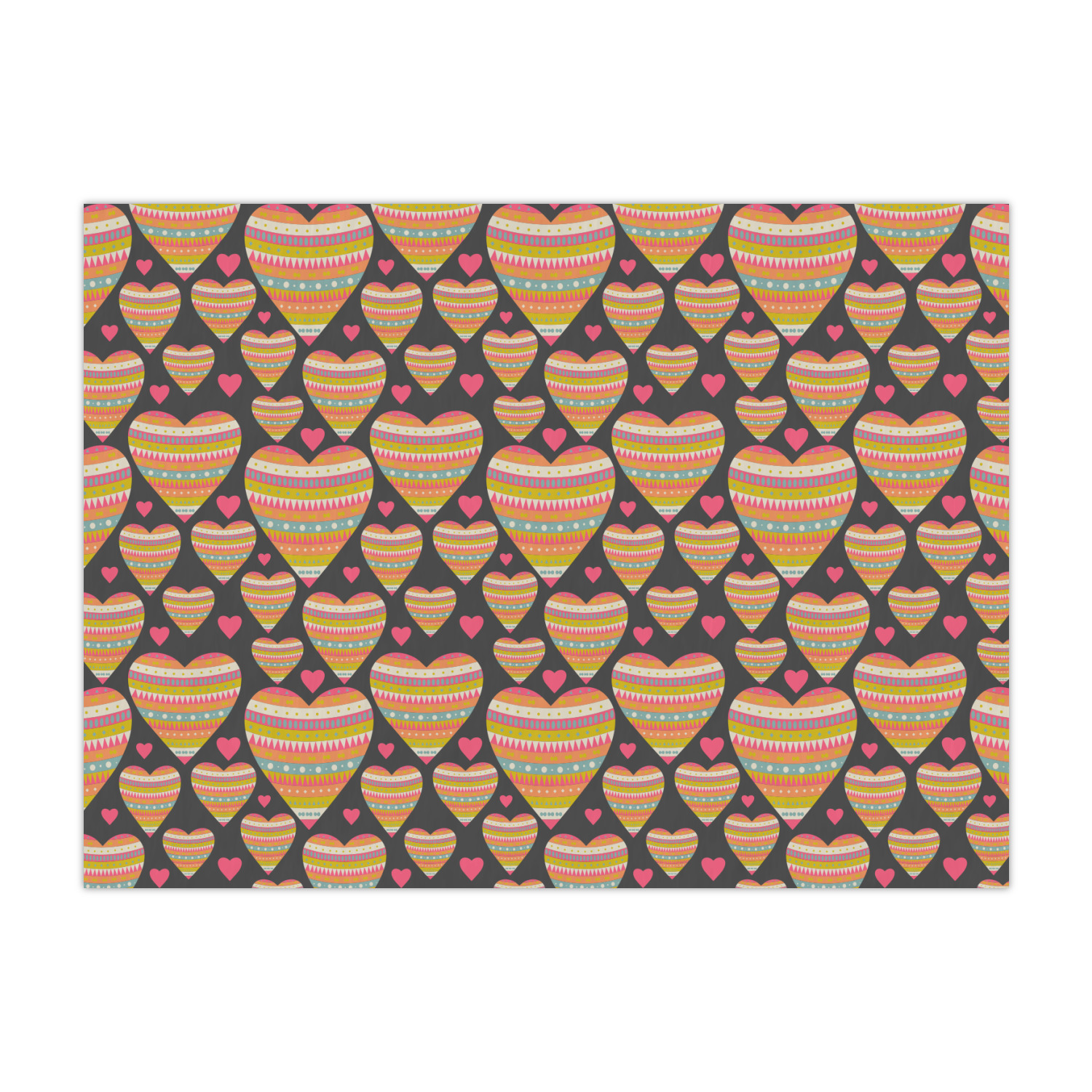 This Valentine's Day design looks sweet enough to eat. Multicolored hearts, each one filled with stripes and triangles and patterns of all kinds, are set on a crisp white background.