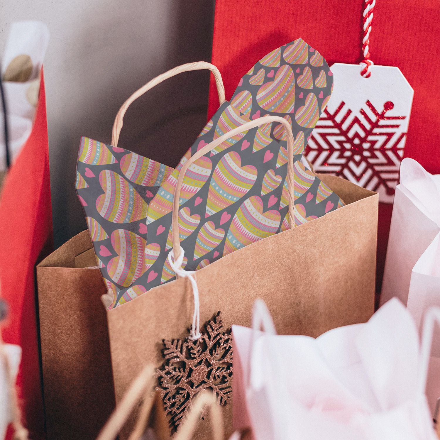 The default design templates on our tissue paper are patterns; however, you can customize your tissue paper sheets to have any type of artwork or images. Simply change them in our design studio by selection something from our design elements library, or upload your own logo, photos or images.
