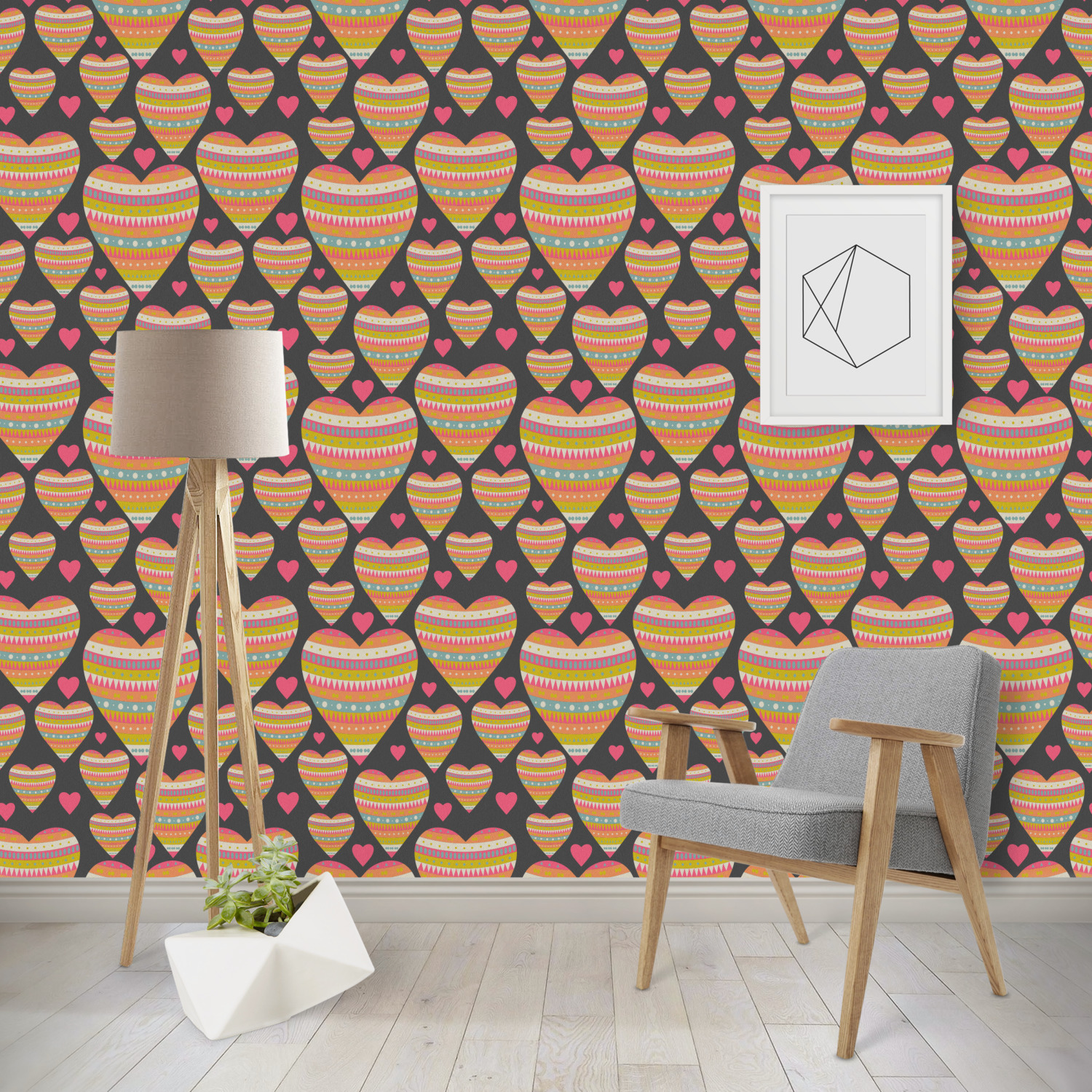 This Valentine's Day design looks sweet enough to eat. Multicolored hearts, each one filled with stripes and triangles and patterns of all kinds, are set on a crisp white background.