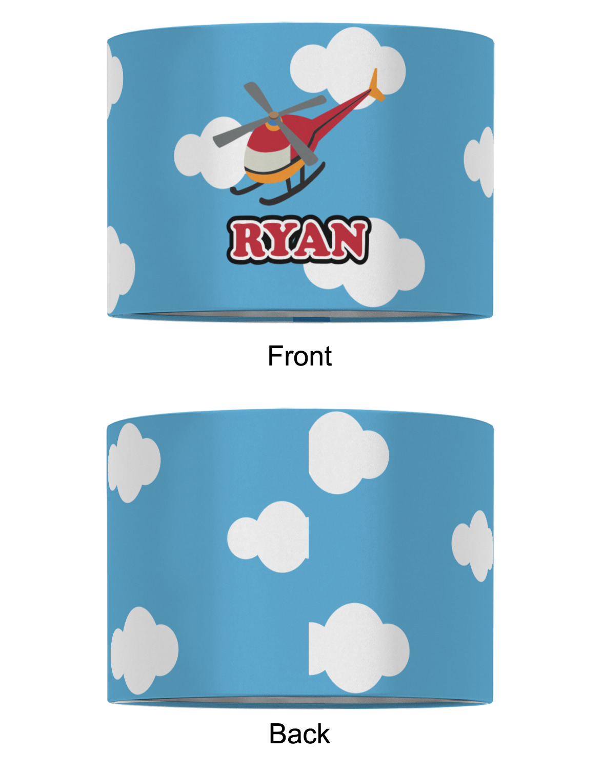 Calling all aviation enthusiast! Soaring through on a backdrop of a beautiful blue cloudy sky is our fun flying helicopter brightly colored in shades of reds and oranges. Don't forget to add that special touch by customizing the design with the name of your choice.