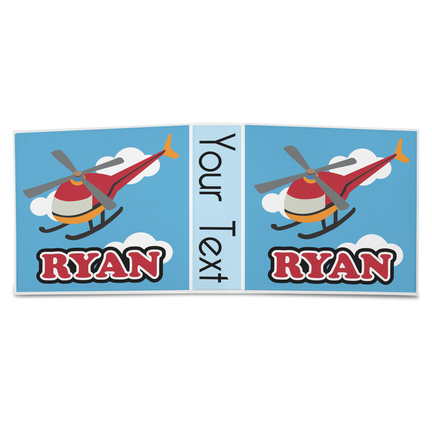 Calling all aviation enthusiast! Soaring through on a backdrop of a beautiful blue cloudy sky is our fun flying helicopter brightly colored in shades of reds and oranges. Don't forget to add that special touch by customizing the design with the name of your choice.