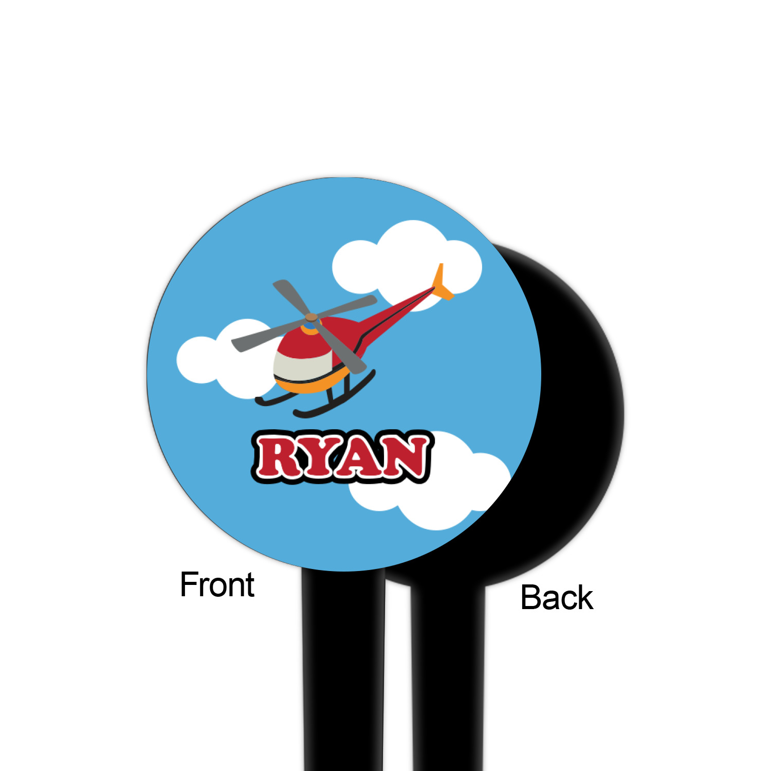 Calling all aviation enthusiast! Soaring through on a backdrop of a beautiful blue cloudy sky is our fun flying helicopter brightly colored in shades of reds and oranges. Don't forget to add that special touch by customizing the design with the name of your choice.
