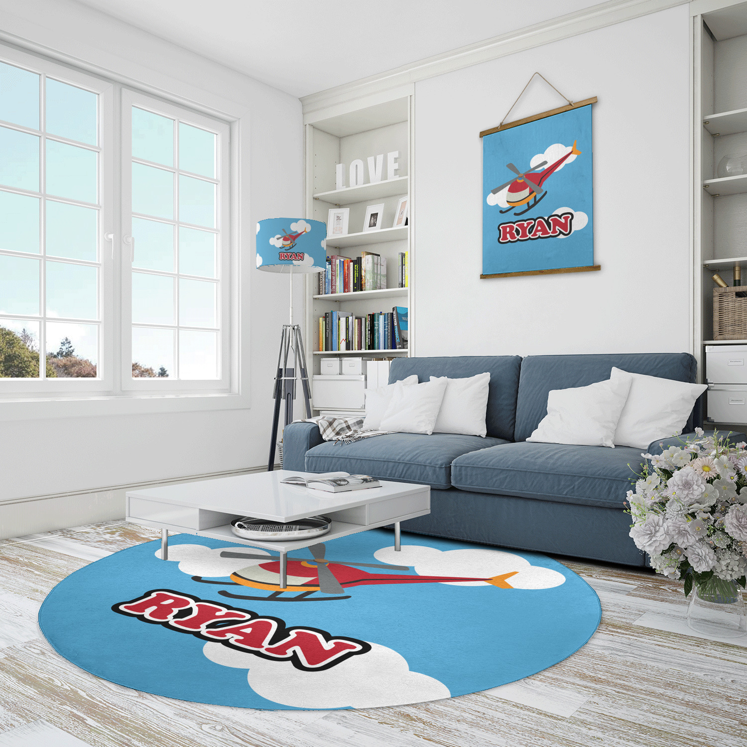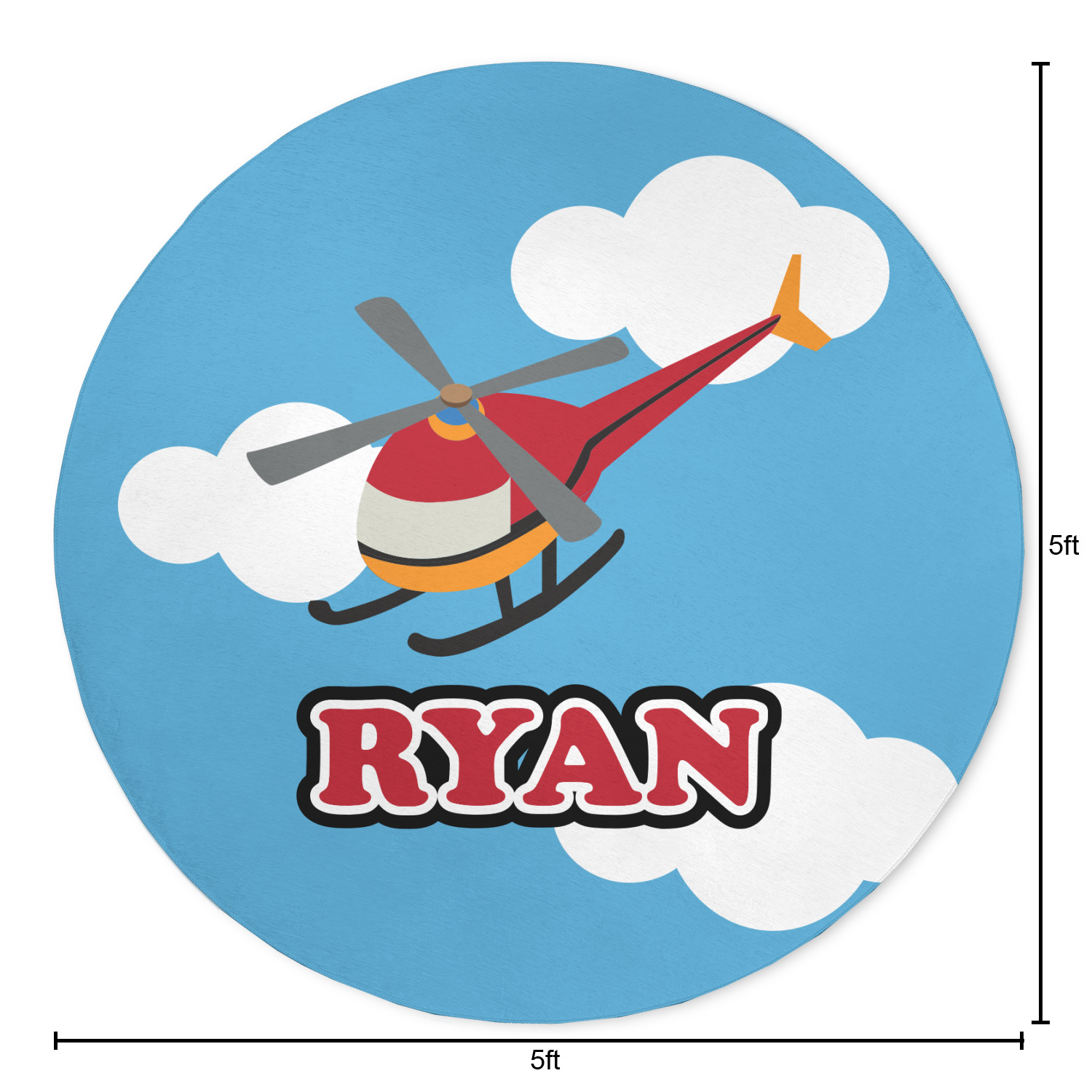 Calling all aviation enthusiast! Soaring through on a backdrop of a beautiful blue cloudy sky is our fun flying helicopter brightly colored in shades of reds and oranges. Don't forget to add that special touch by customizing the design with the name of your choice.
