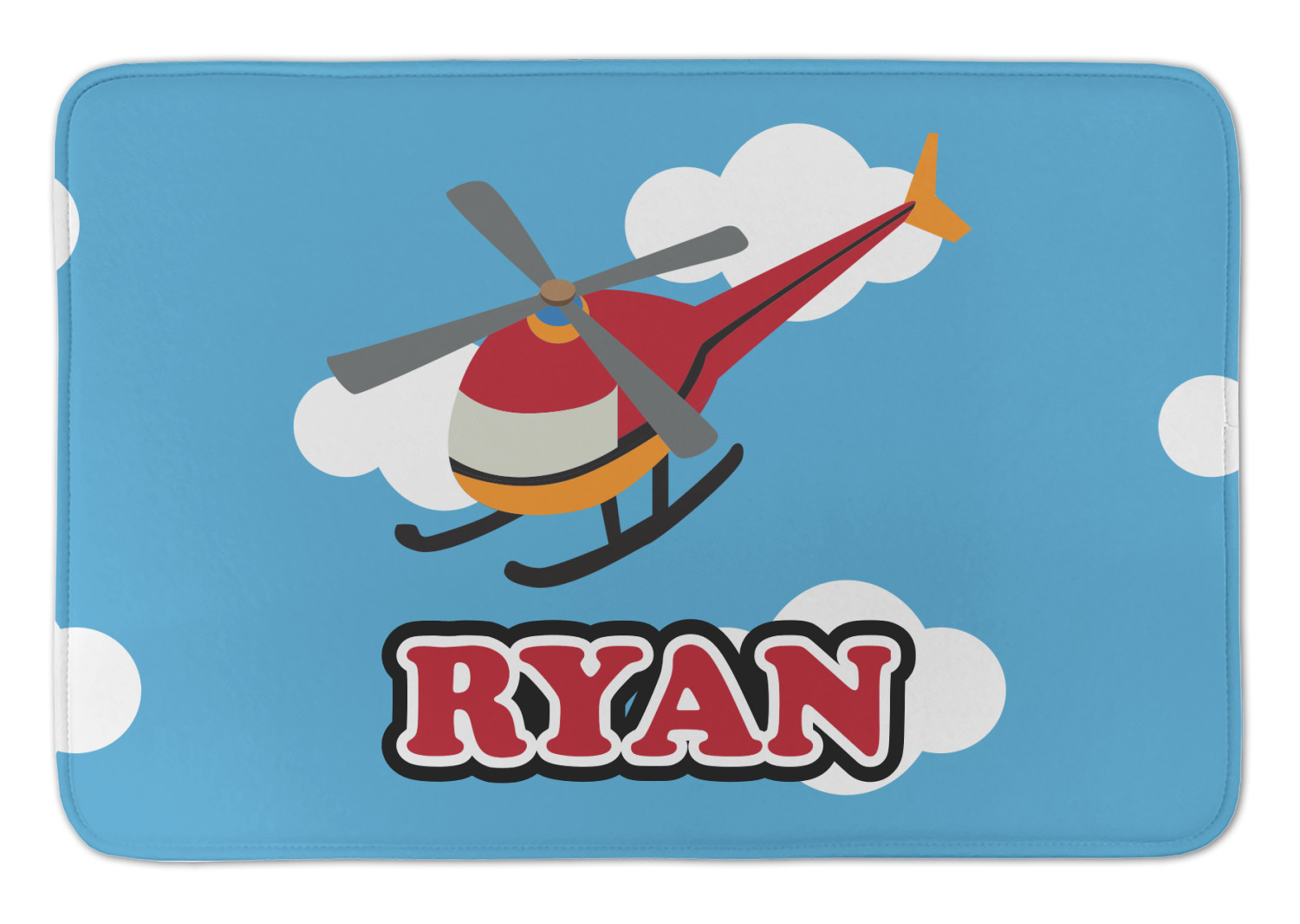 Calling all aviation enthusiast! Soaring through on a backdrop of a beautiful blue cloudy sky is our fun flying helicopter brightly colored in shades of reds and oranges. Don't forget to add that special touch by customizing the design with the name of your choice.