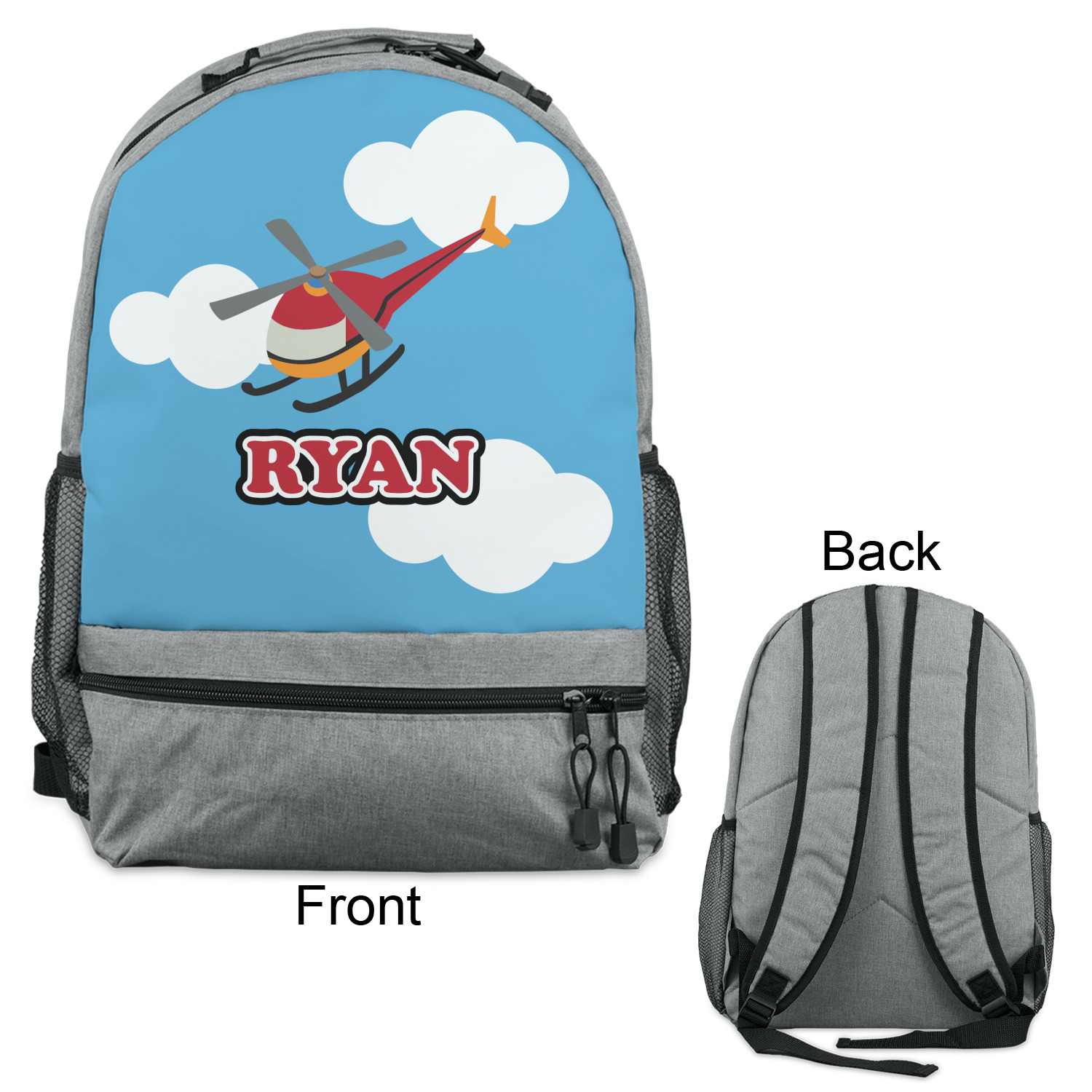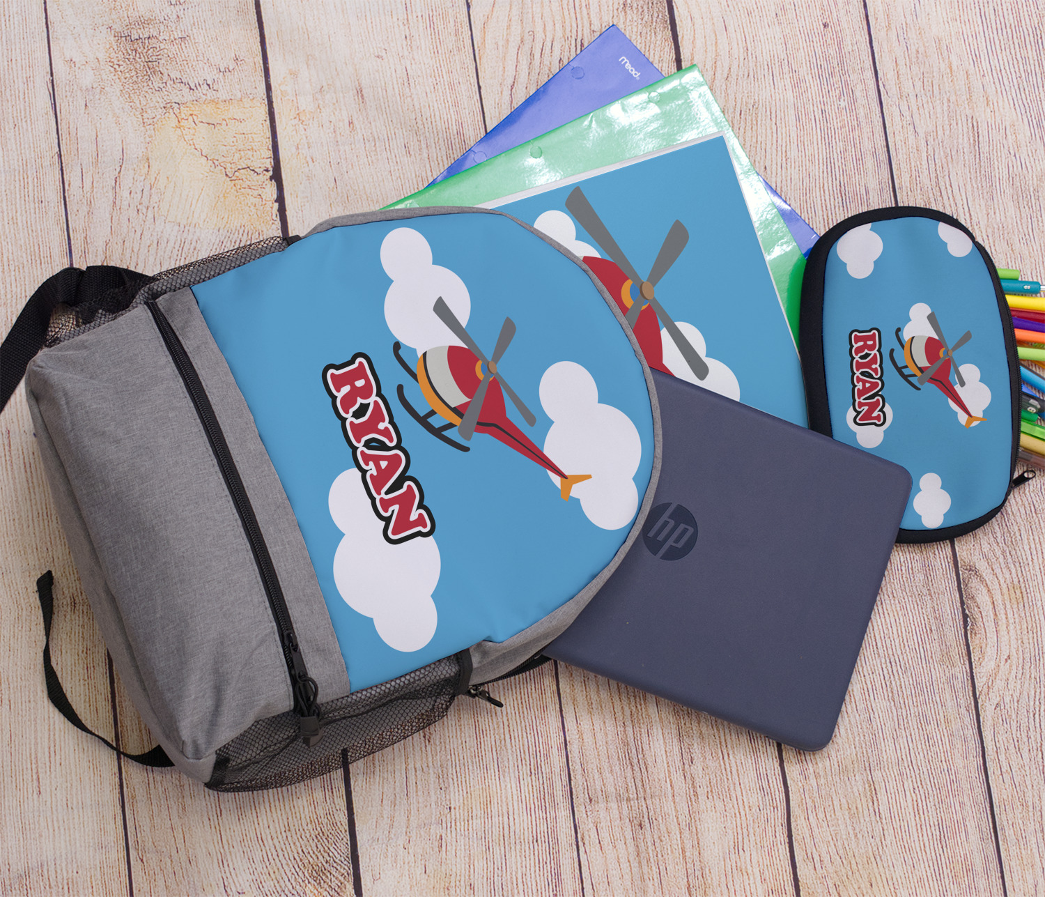 Calling all aviation enthusiast! Soaring through on a backdrop of a beautiful blue cloudy sky is our fun flying helicopter brightly colored in shades of reds and oranges. Don't forget to add that special touch by customizing the design with the name of your choice.