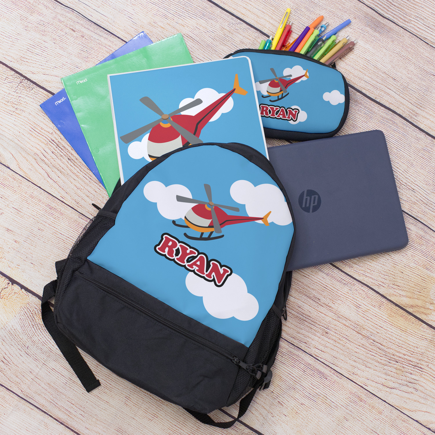 Calling all aviation enthusiast! Soaring through on a backdrop of a beautiful blue cloudy sky is our fun flying helicopter brightly colored in shades of reds and oranges. Don't forget to add that special touch by customizing the design with the name of your choice.