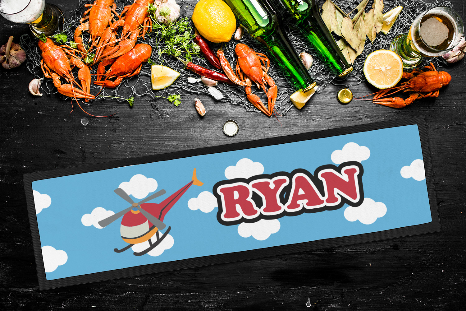Calling all aviation enthusiast! Soaring through on a backdrop of a beautiful blue cloudy sky is our fun flying helicopter brightly colored in shades of reds and oranges. Don't forget to add that special touch by customizing the design with the name of your choice.