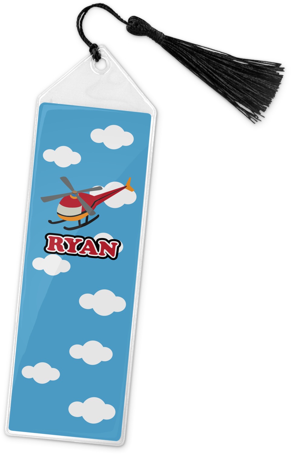 Your personalized bookmark is made of a sturdy, clear vinyl, and is approximately 7.5" x 2.25". We display your personalization on vinyl inserts that are placed on both sides. Accompanying each book marker is a black, fringe tassel that attaches to the reinforced, triangular header.