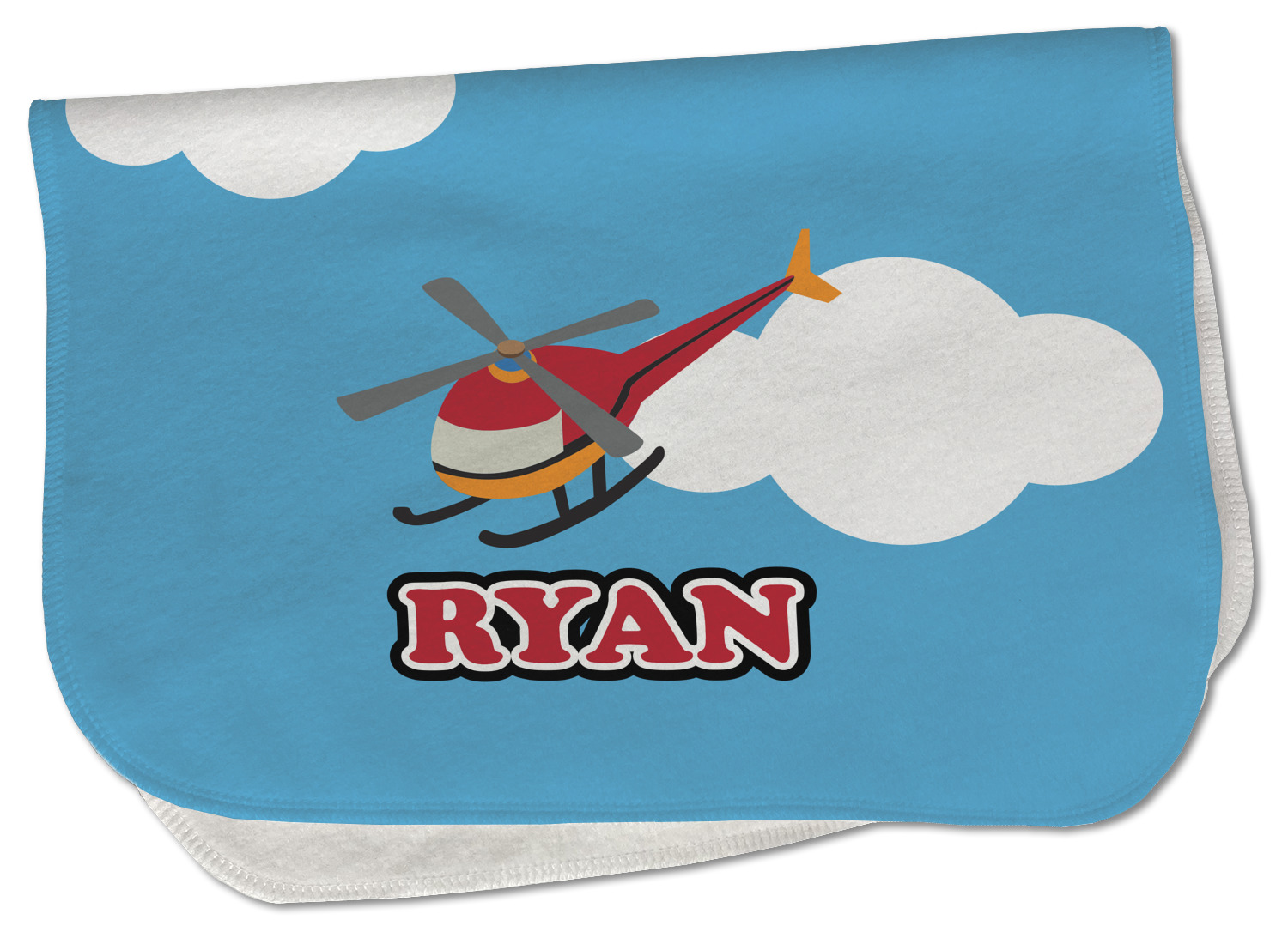 Calling all aviation enthusiast! Soaring through on a backdrop of a beautiful blue cloudy sky is our fun flying helicopter brightly colored in shades of reds and oranges. Don't forget to add that special touch by customizing the design with the name of your choice.