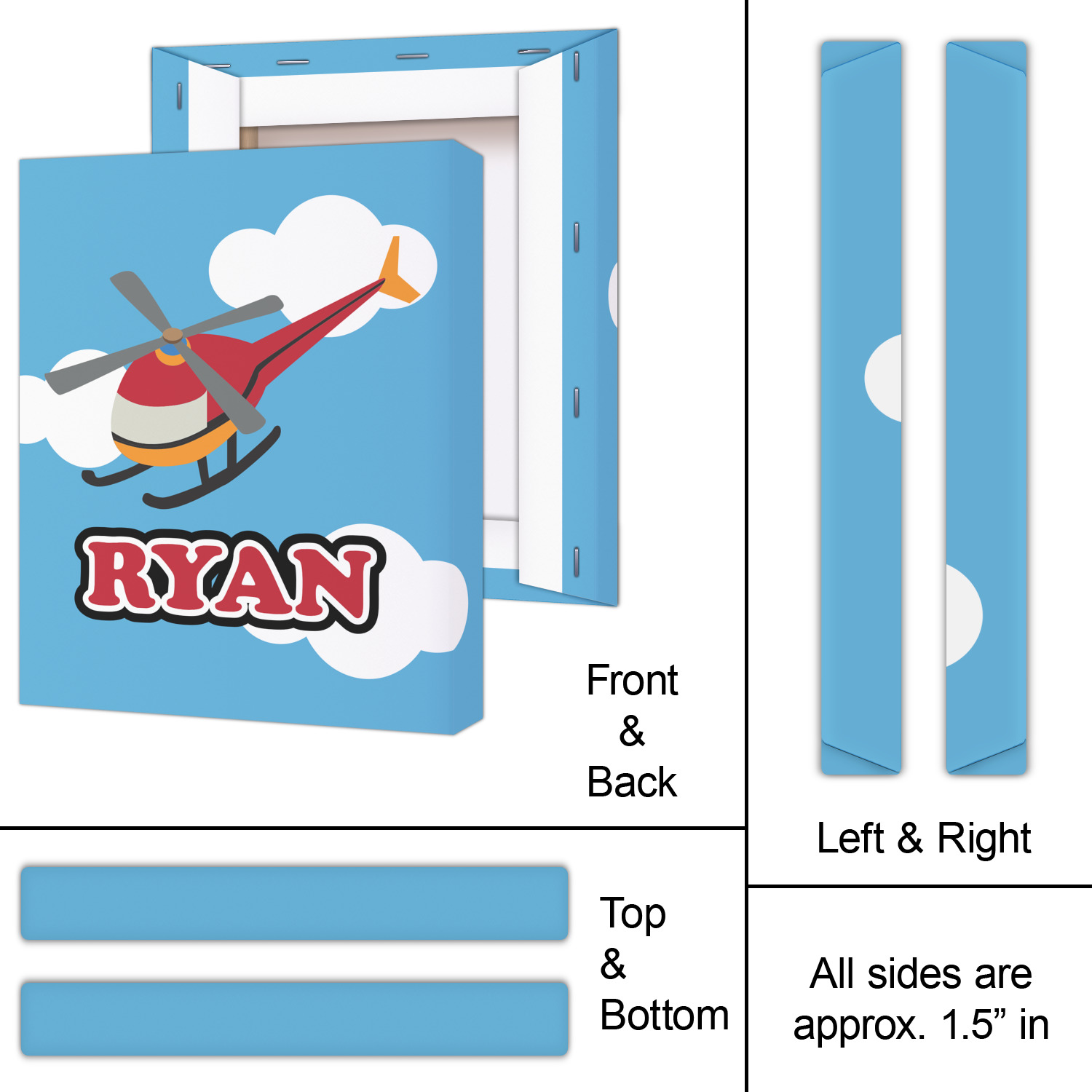 Calling all aviation enthusiast! Soaring through on a backdrop of a beautiful blue cloudy sky is our fun flying helicopter brightly colored in shades of reds and oranges. Don't forget to add that special touch by customizing the design with the name of your choice.