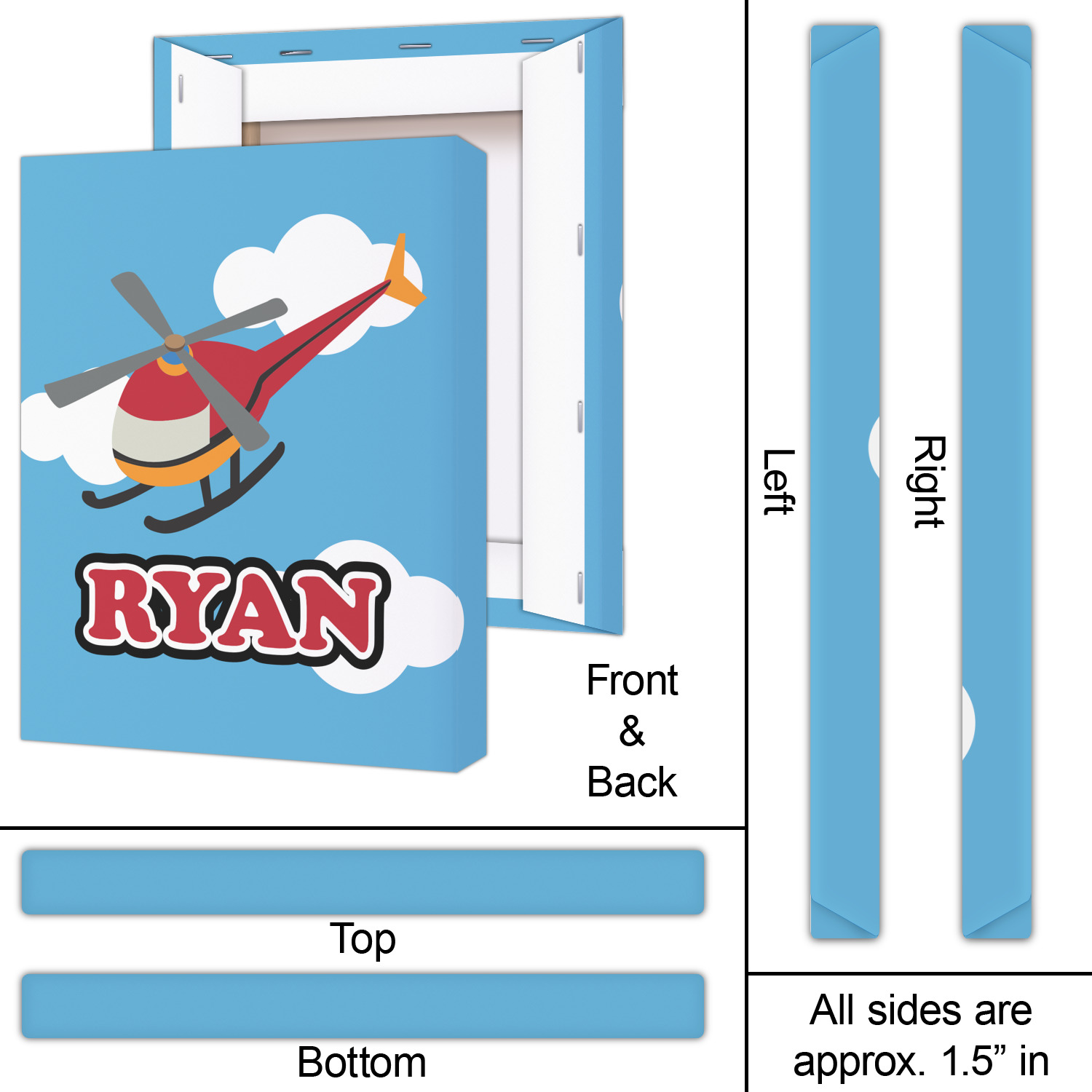 Calling all aviation enthusiast! Soaring through on a backdrop of a beautiful blue cloudy sky is our fun flying helicopter brightly colored in shades of reds and oranges. Don't forget to add that special touch by customizing the design with the name of your choice.