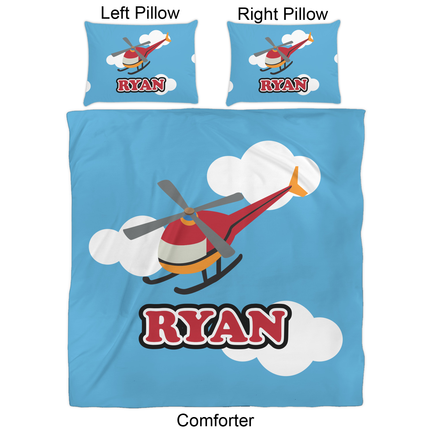 Calling all aviation enthusiast! Soaring through on a backdrop of a beautiful blue cloudy sky is our fun flying helicopter brightly colored in shades of reds and oranges. Don't forget to add that special touch by customizing the design with the name of your choice.