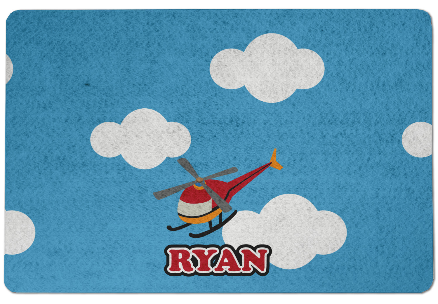 Calling all aviation enthusiast! Soaring through on a backdrop of a beautiful blue cloudy sky is our fun flying helicopter brightly colored in shades of reds and oranges. Don't forget to add that special touch by customizing the design with the name of your choice.