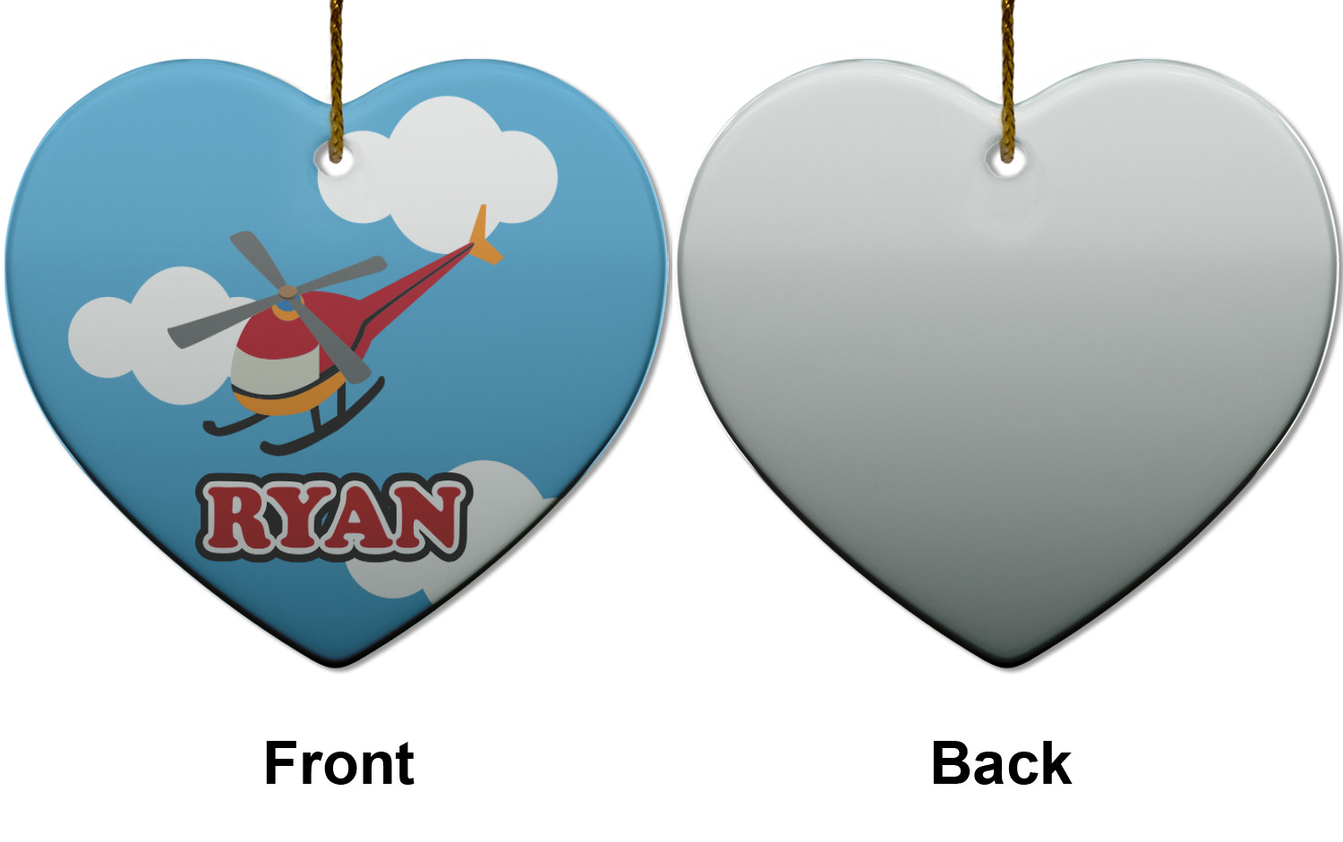 Calling all aviation enthusiast! Soaring through on a backdrop of a beautiful blue cloudy sky is our fun flying helicopter brightly colored in shades of reds and oranges. Don't forget to add that special touch by customizing the design with the name of your choice.