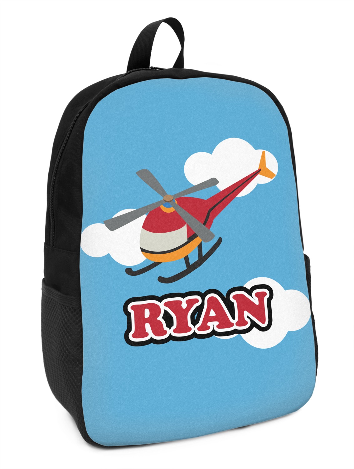 Calling all aviation enthusiast! Soaring through on a backdrop of a beautiful blue cloudy sky is our fun flying helicopter brightly colored in shades of reds and oranges. Don't forget to add that special touch by customizing the design with the name of your choice.