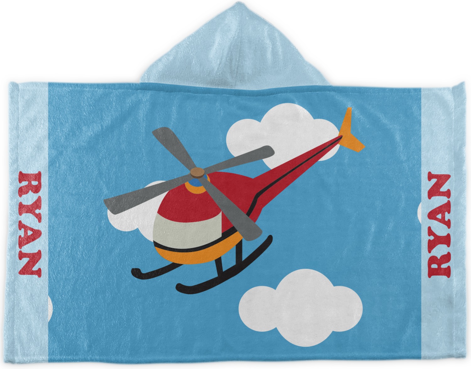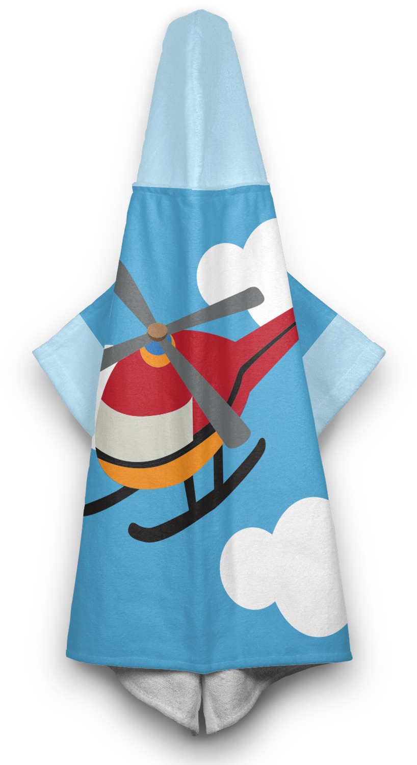 Calling all aviation enthusiast! Soaring through on a backdrop of a beautiful blue cloudy sky is our fun flying helicopter brightly colored in shades of reds and oranges. Don't forget to add that special touch by customizing the design with the name of your choice.