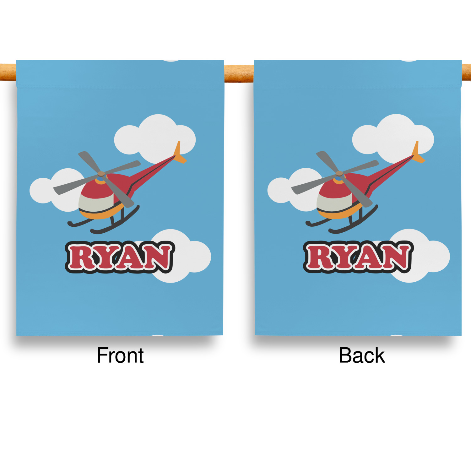 Calling all aviation enthusiast! Soaring through on a backdrop of a beautiful blue cloudy sky is our fun flying helicopter brightly colored in shades of reds and oranges. Don't forget to add that special touch by customizing the design with the name of your choice.