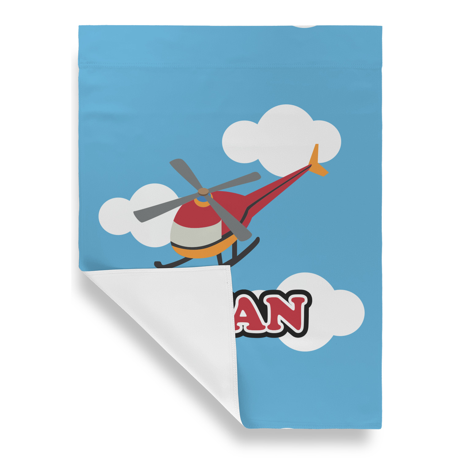 Calling all aviation enthusiast! Soaring through on a backdrop of a beautiful blue cloudy sky is our fun flying helicopter brightly colored in shades of reds and oranges. Don't forget to add that special touch by customizing the design with the name of your choice.