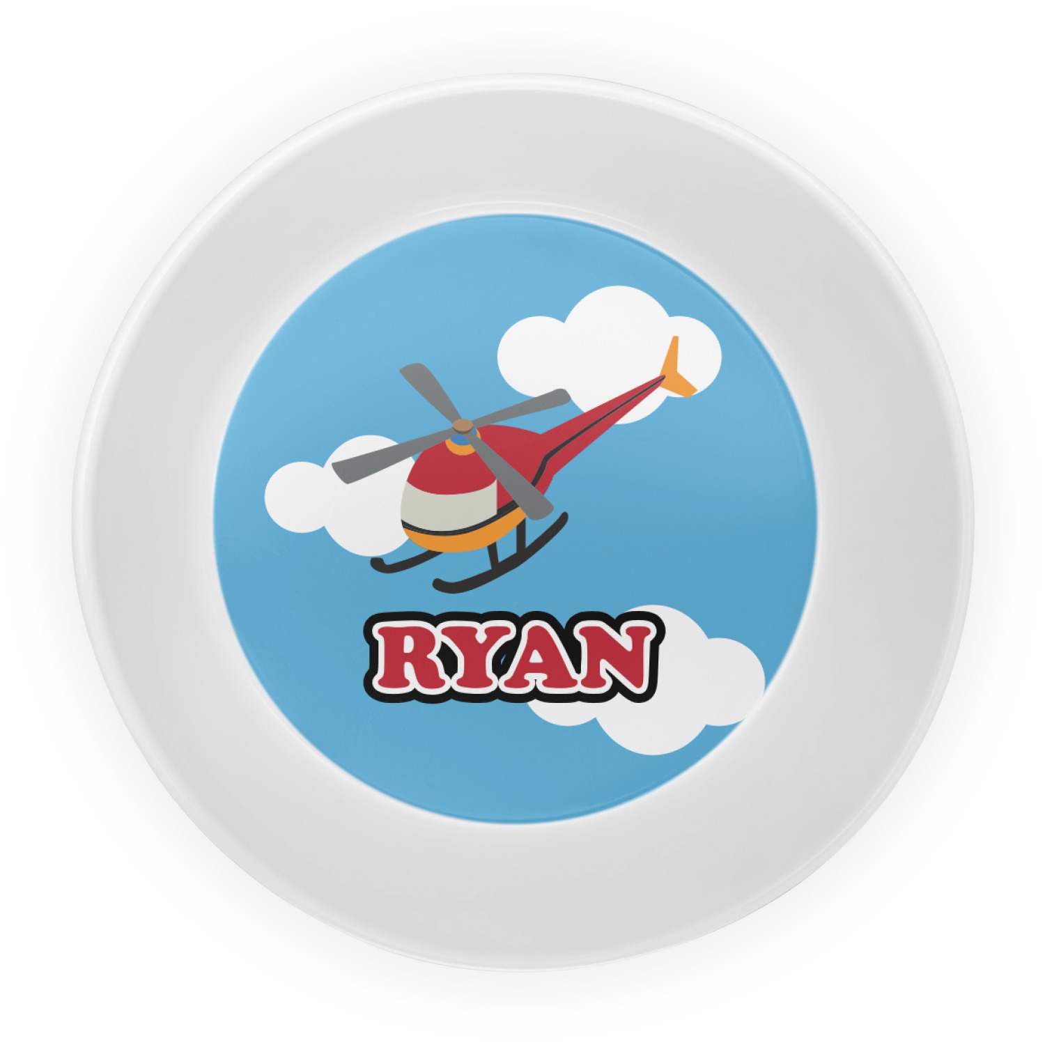 Calling all aviation enthusiast! Soaring through on a backdrop of a beautiful blue cloudy sky is our fun flying helicopter brightly colored in shades of reds and oranges. Don't forget to add that special touch by customizing the design with the name of your choice.