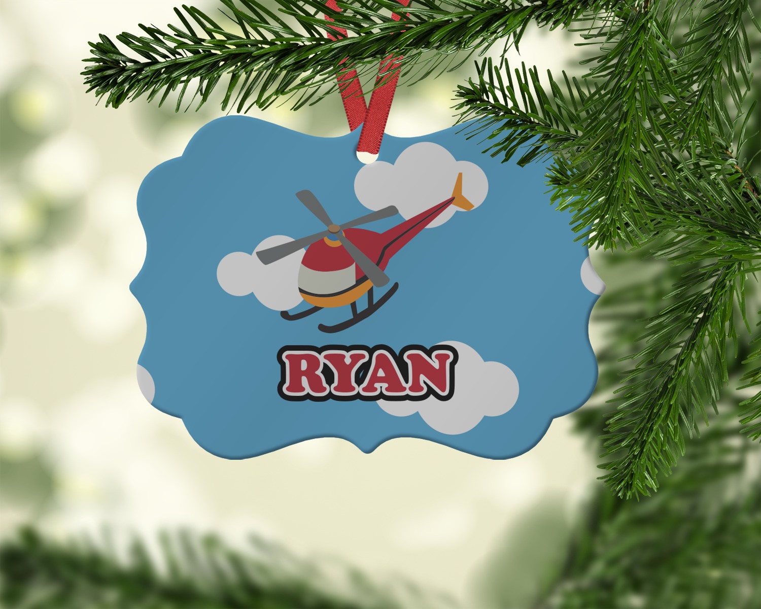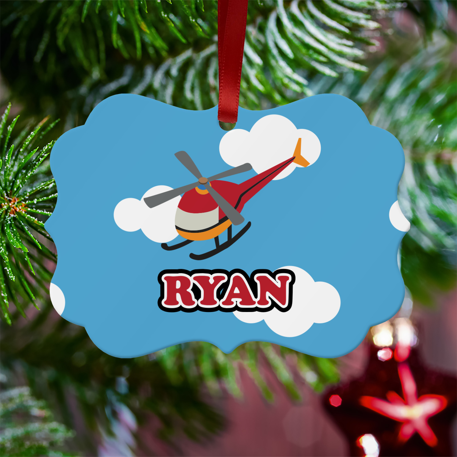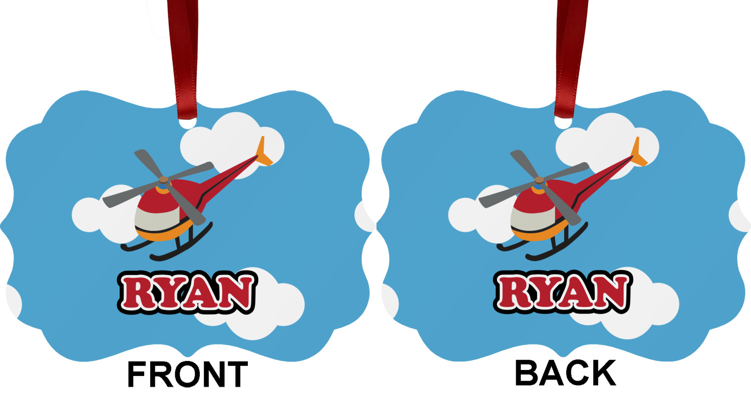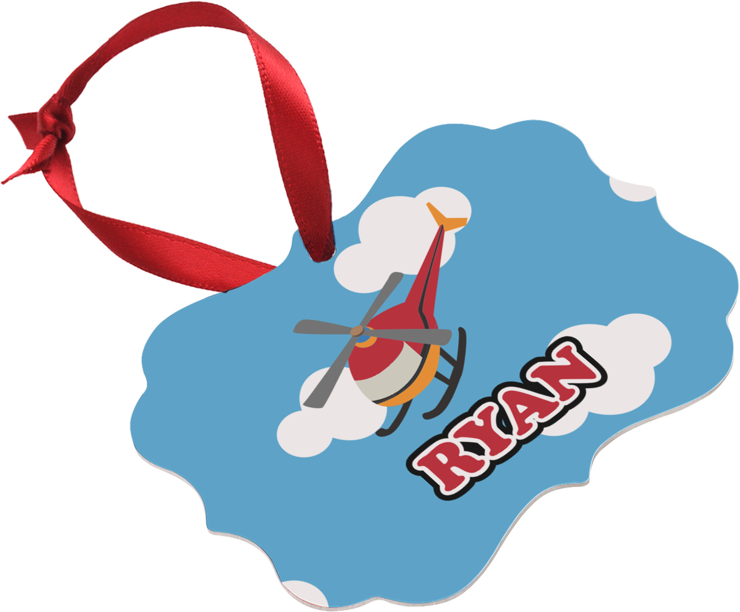 Calling all aviation enthusiast! Soaring through on a backdrop of a beautiful blue cloudy sky is our fun flying helicopter brightly colored in shades of reds and oranges. Don't forget to add that special touch by customizing the design with the name of your choice.