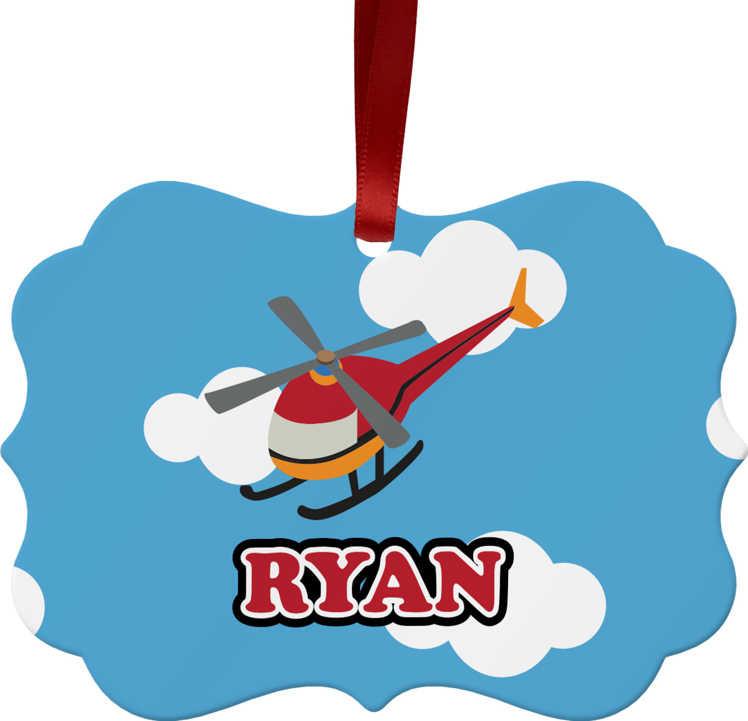 Calling all aviation enthusiast! Soaring through on a backdrop of a beautiful blue cloudy sky is our fun flying helicopter brightly colored in shades of reds and oranges. Don't forget to add that special touch by customizing the design with the name of your choice.