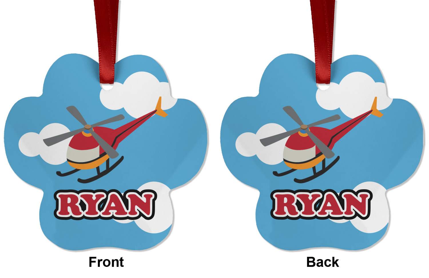 Calling all aviation enthusiast! Soaring through on a backdrop of a beautiful blue cloudy sky is our fun flying helicopter brightly colored in shades of reds and oranges. Don't forget to add that special touch by customizing the design with the name of your choice.