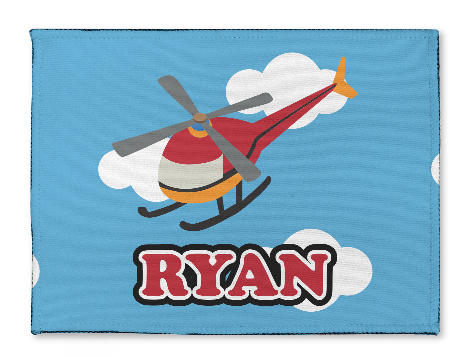 Calling all aviation enthusiast! Soaring through on a backdrop of a beautiful blue cloudy sky is our fun flying helicopter brightly colored in shades of reds and oranges. Don't forget to add that special touch by customizing the design with the name of your choice.