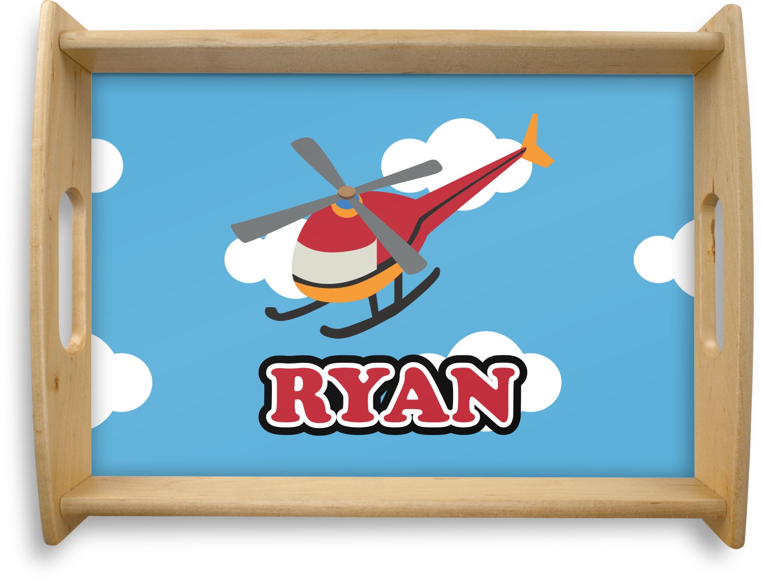 Calling all aviation enthusiast! Soaring through on a backdrop of a beautiful blue cloudy sky is our fun flying helicopter brightly colored in shades of reds and oranges. Don't forget to add that special touch by customizing the design with the name of your choice.