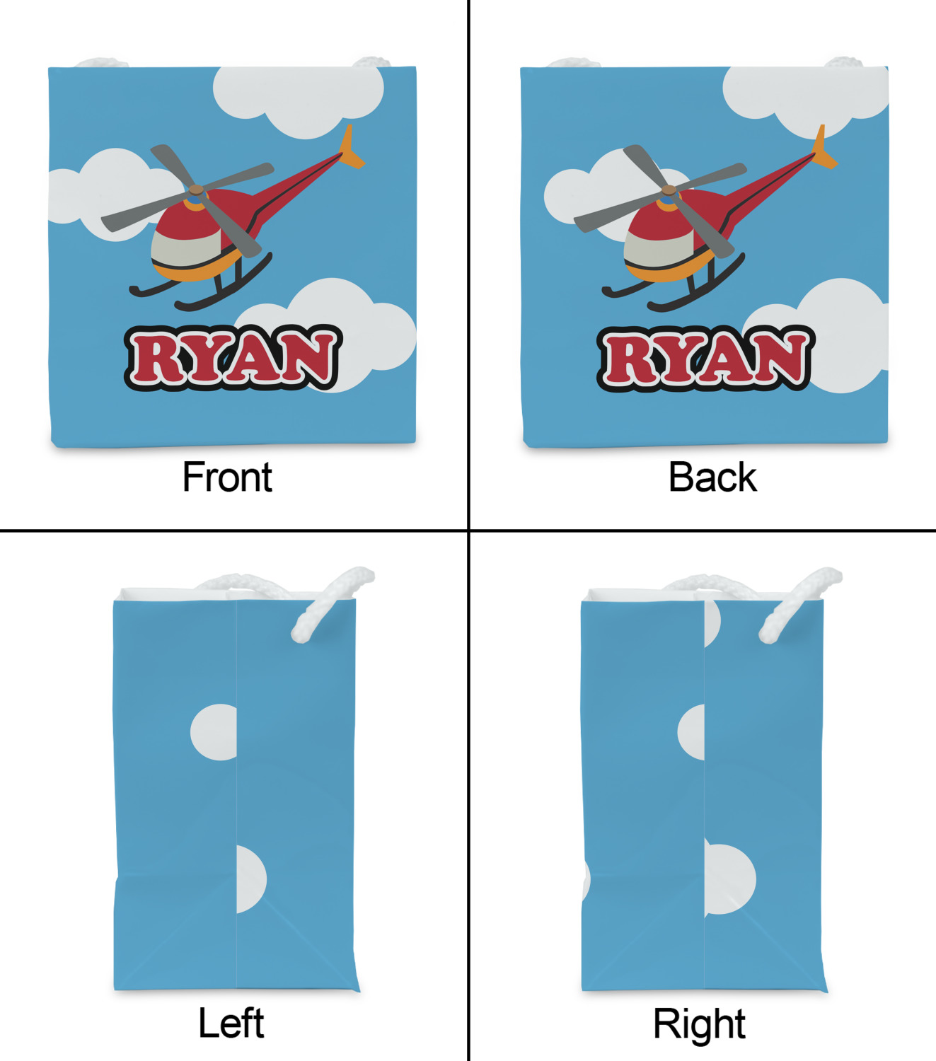 Calling all aviation enthusiast! Soaring through on a backdrop of a beautiful blue cloudy sky is our fun flying helicopter brightly colored in shades of reds and oranges. Don't forget to add that special touch by customizing the design with the name of your choice.