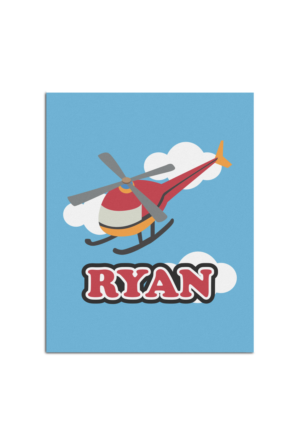 Calling all aviation enthusiast! Soaring through on a backdrop of a beautiful blue cloudy sky is our fun flying helicopter brightly colored in shades of reds and oranges. Don't forget to add that special touch by customizing the design with the name of your choice.