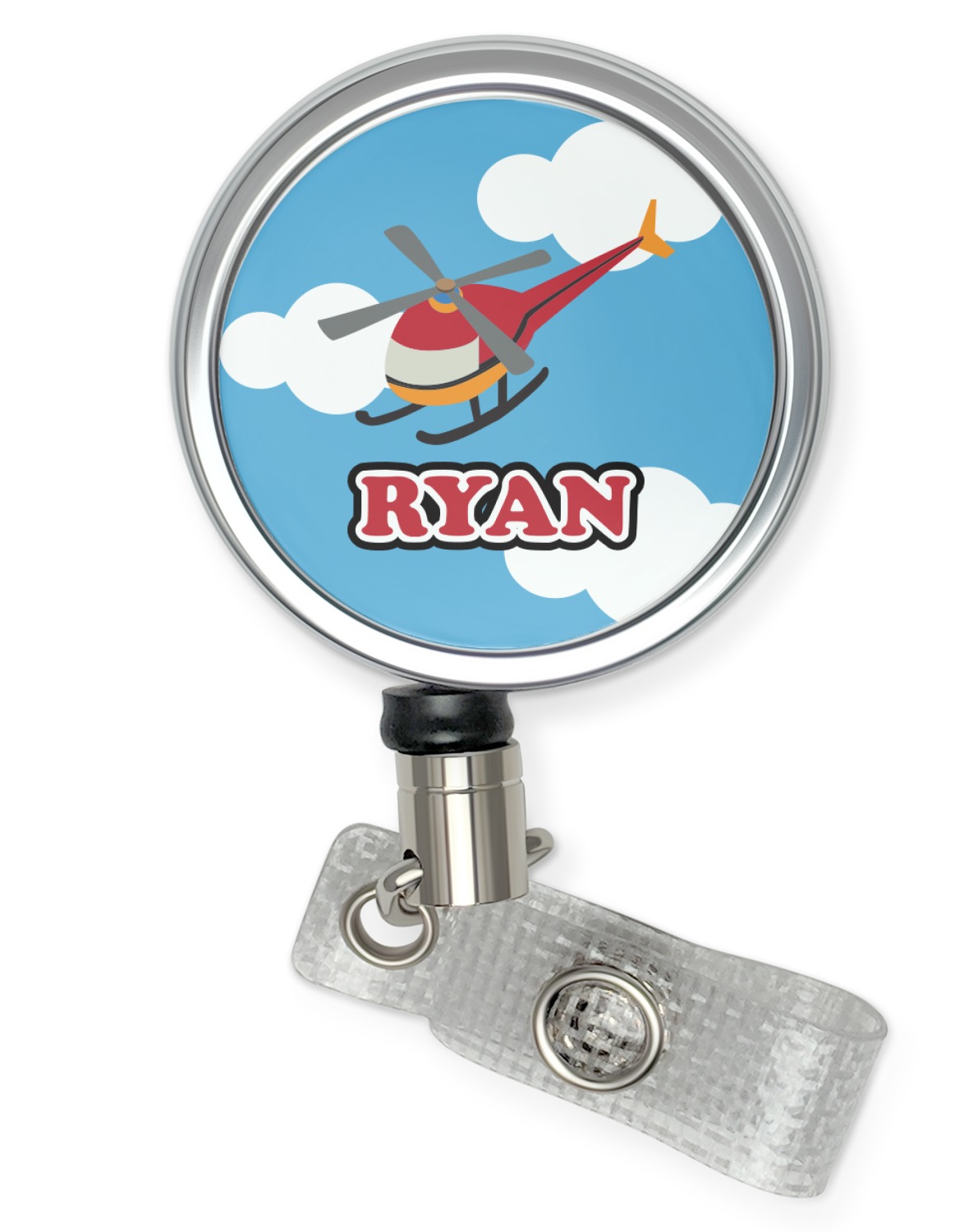 Calling all aviation enthusiast! Soaring through on a backdrop of a beautiful blue cloudy sky is our fun flying helicopter brightly colored in shades of reds and oranges. Don't forget to add that special touch by customizing the design with the name of your choice.
