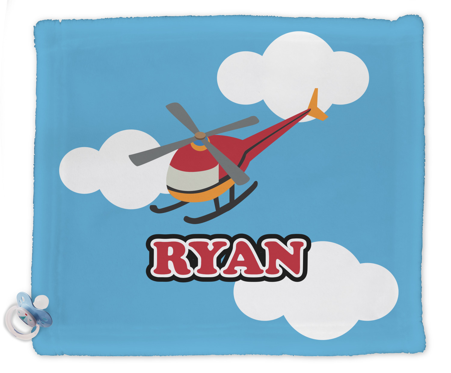 Calling all aviation enthusiast! Soaring through on a backdrop of a beautiful blue cloudy sky is our fun flying helicopter brightly colored in shades of reds and oranges. Don't forget to add that special touch by customizing the design with the name of your choice.