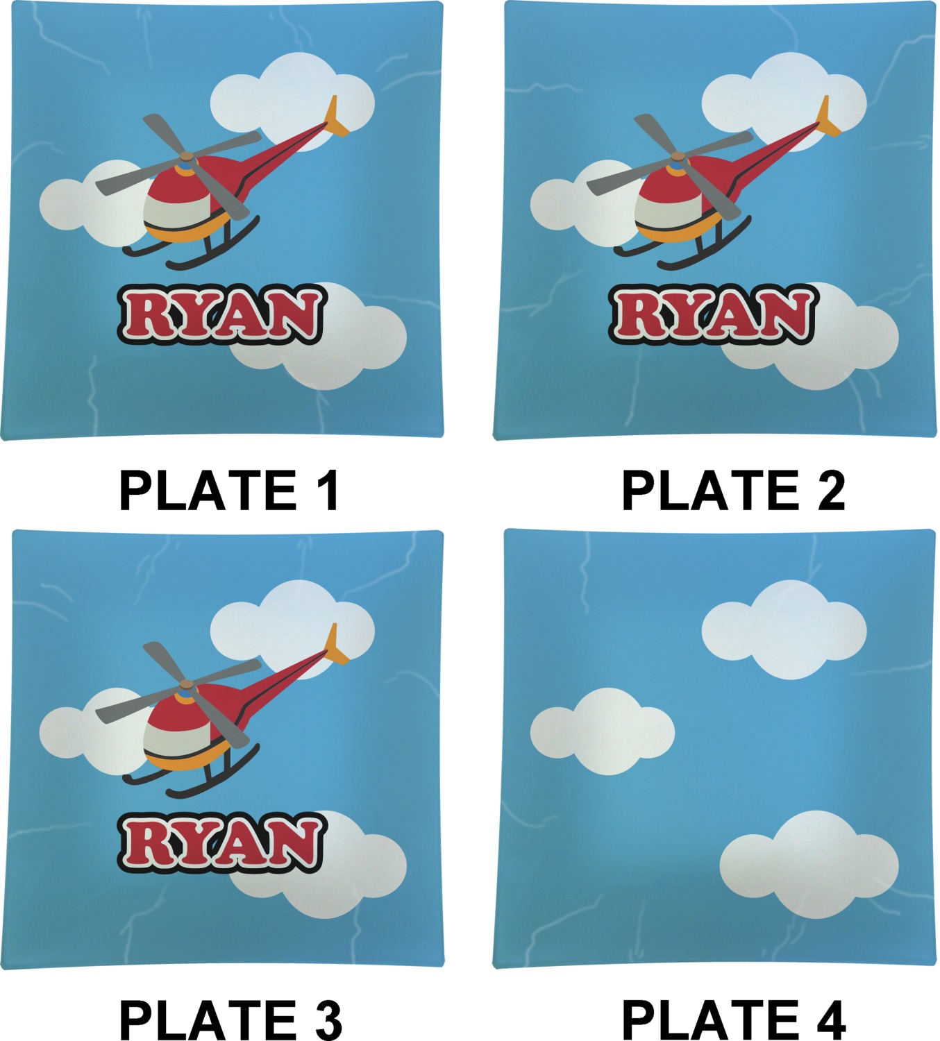 Calling all aviation enthusiast! Soaring through on a backdrop of a beautiful blue cloudy sky is our fun flying helicopter brightly colored in shades of reds and oranges. Don't forget to add that special touch by customizing the design with the name of your choice.