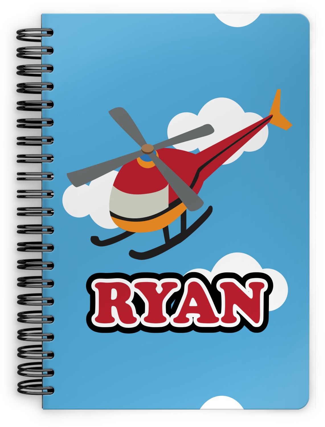 Calling all aviation enthusiast! Soaring through on a backdrop of a beautiful blue cloudy sky is our fun flying helicopter brightly colored in shades of reds and oranges. Don't forget to add that special touch by customizing the design with the name of your choice.