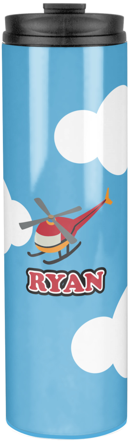 Calling all aviation enthusiast! Soaring through on a backdrop of a beautiful blue cloudy sky is our fun flying helicopter brightly colored in shades of reds and oranges. Don't forget to add that special touch by customizing the design with the name of your choice.
