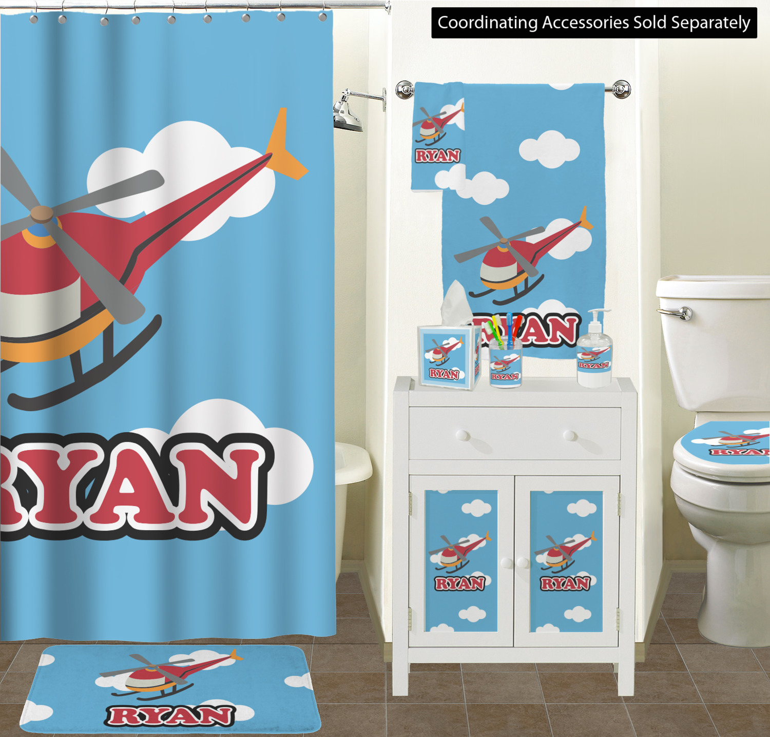 Calling all aviation enthusiast! Soaring through on a backdrop of a beautiful blue cloudy sky is our fun flying helicopter brightly colored in shades of reds and oranges. Don't forget to add that special touch by customizing the design with the name of your choice.