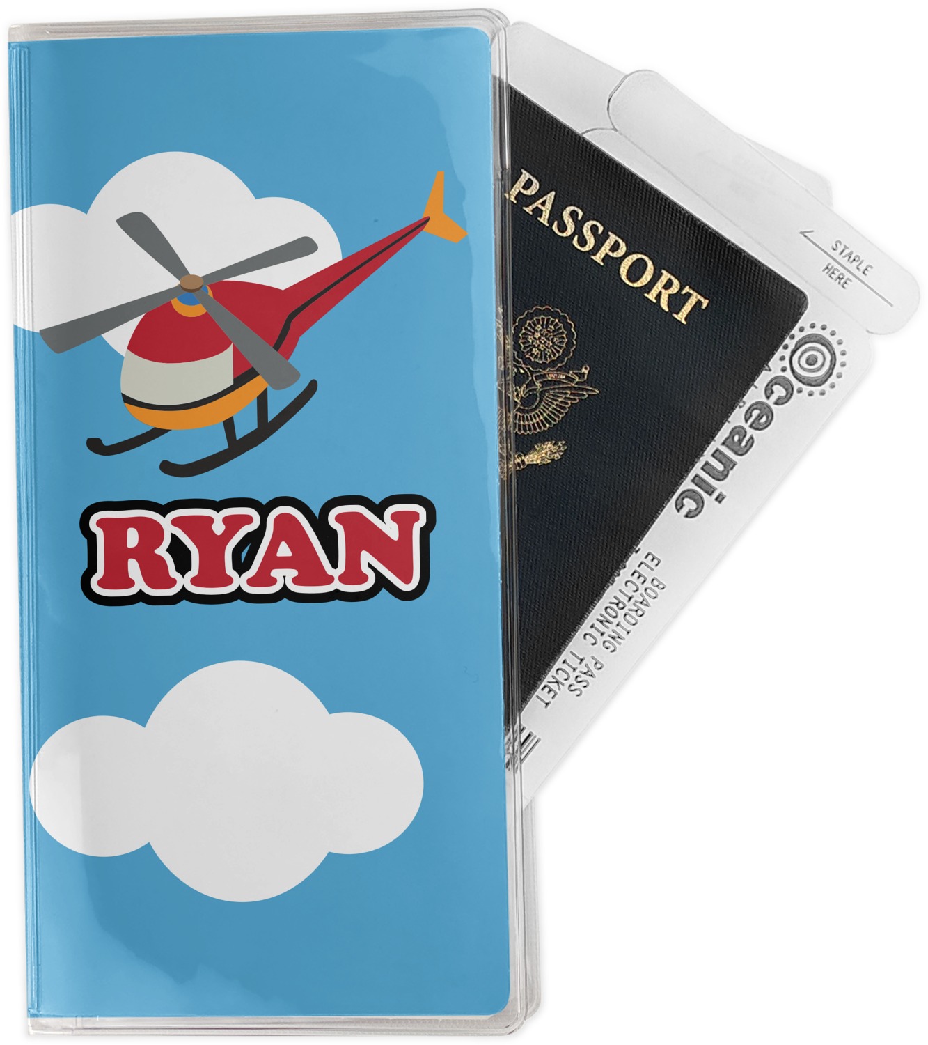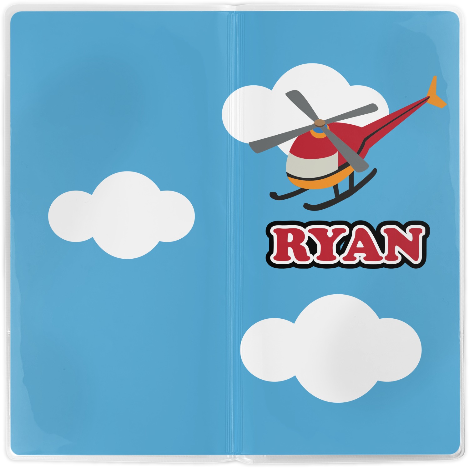 Calling all aviation enthusiast! Soaring through on a backdrop of a beautiful blue cloudy sky is our fun flying helicopter brightly colored in shades of reds and oranges. Don't forget to add that special touch by customizing the design with the name of your choice.