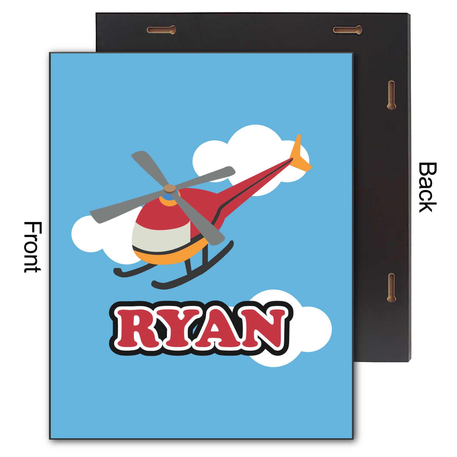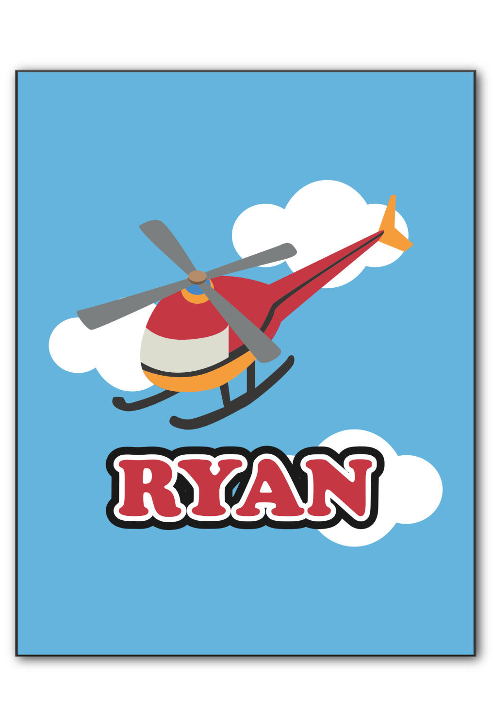 Calling all aviation enthusiast! Soaring through on a backdrop of a beautiful blue cloudy sky is our fun flying helicopter brightly colored in shades of reds and oranges. Don't forget to add that special touch by customizing the design with the name of your choice.