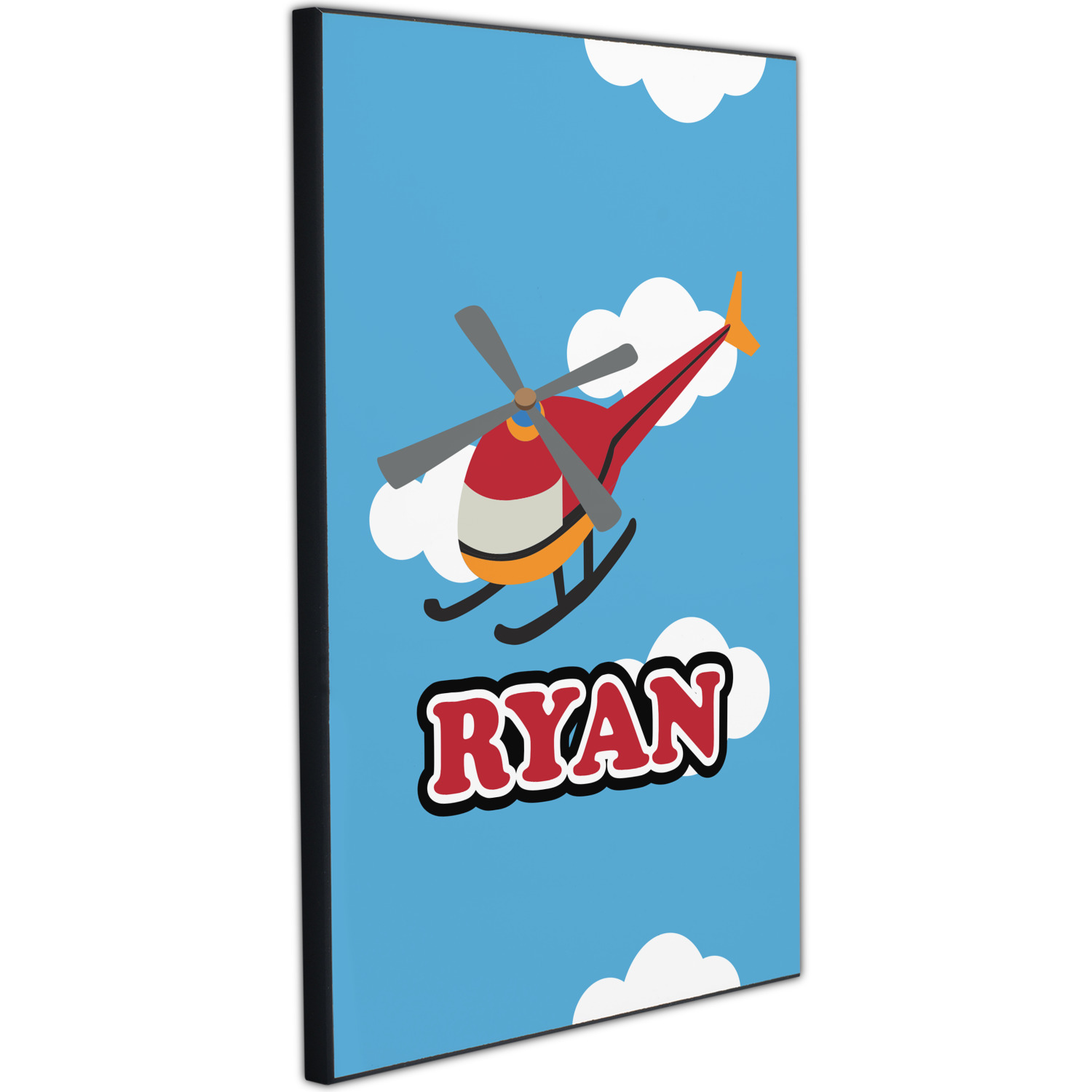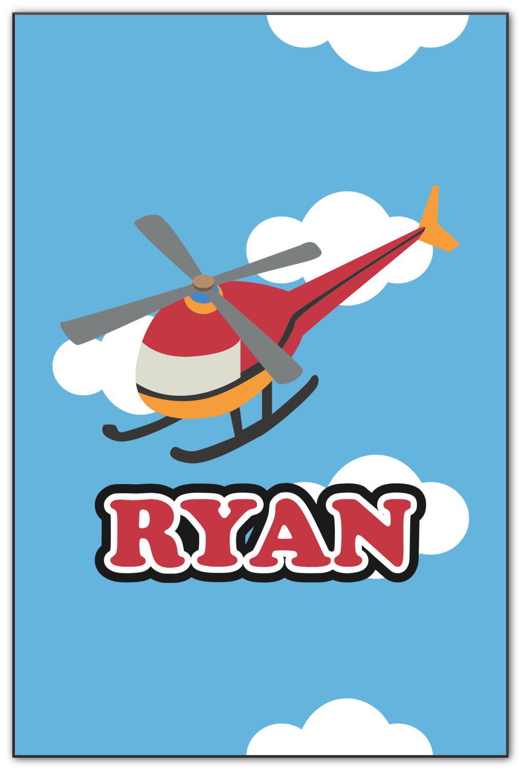 Calling all aviation enthusiast! Soaring through on a backdrop of a beautiful blue cloudy sky is our fun flying helicopter brightly colored in shades of reds and oranges. Don't forget to add that special touch by customizing the design with the name of your choice.