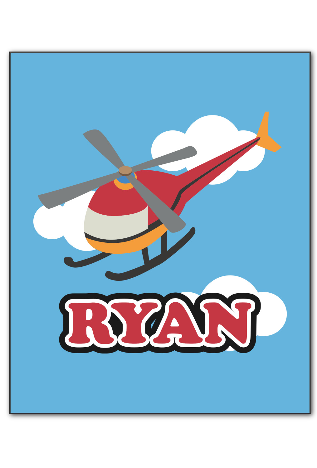 Calling all aviation enthusiast! Soaring through on a backdrop of a beautiful blue cloudy sky is our fun flying helicopter brightly colored in shades of reds and oranges. Don't forget to add that special touch by customizing the design with the name of your choice.