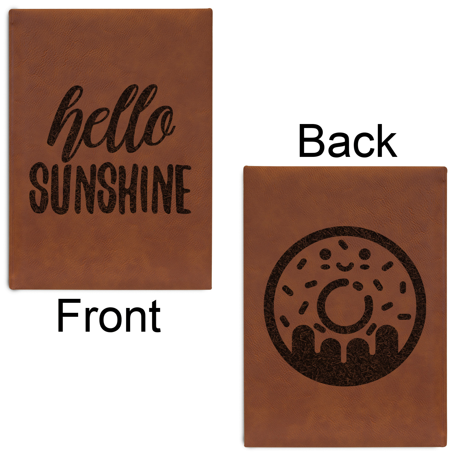 The faux leather covers are a rich cognac / rawhide color and can be customized with your design. From a simple name or monogram or a logo to a detailed mandala - the choice for customization & personalization is truly yours. Customize one of our designs or upload your own.