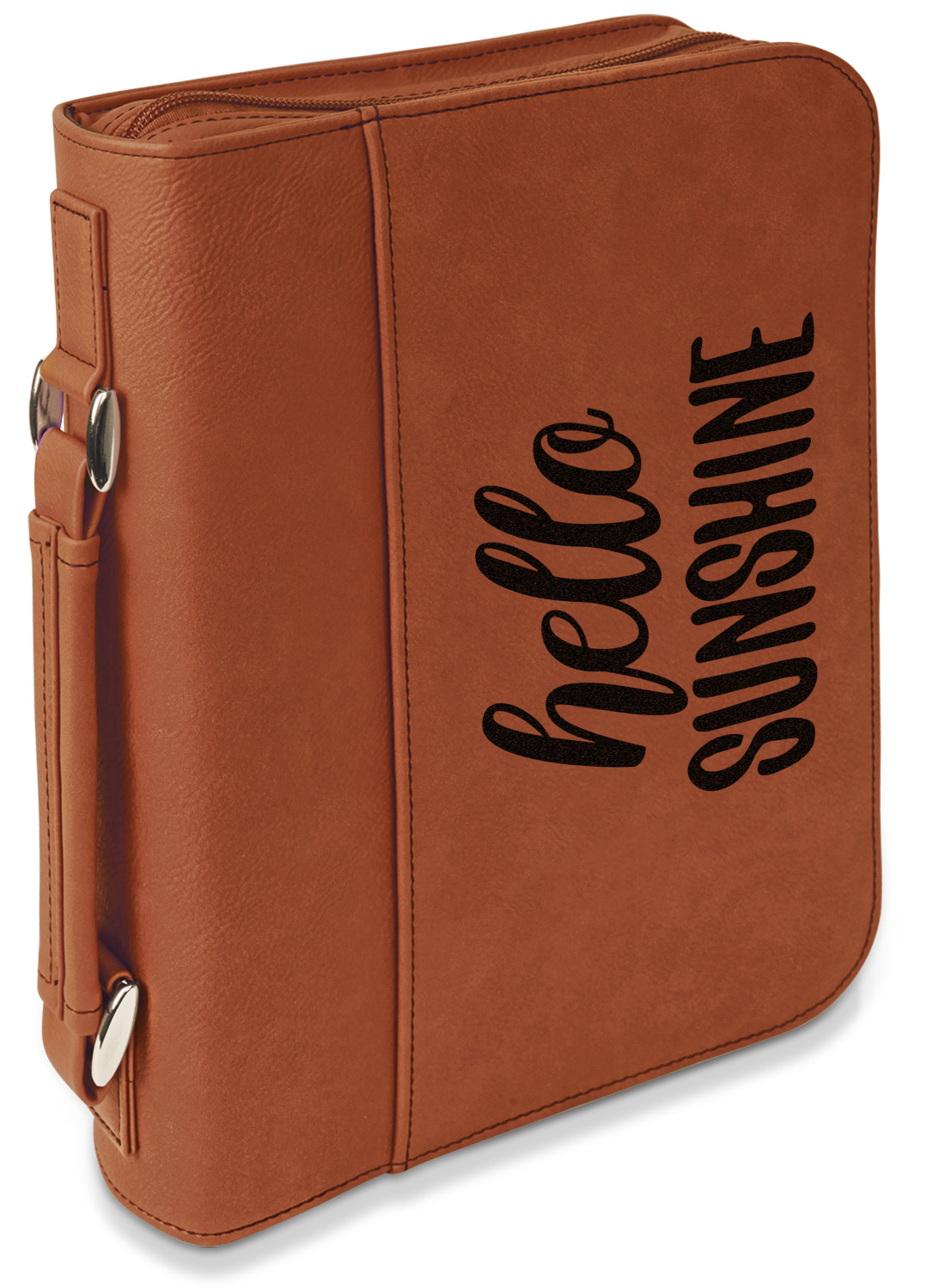 These book covers are fabricated from a fine leatherette in a warm, cognac shade of brown. A wide pocket spans across the front of the book jacket [2,400] and can store any loose papers or notes that you wish to keep. The interior of this personalized Bible cover includes slots on both sides to house the covers of your Bible, and keep it in place. The inside of the spine has a small elastic band to secure a pen. A zipper lines three sides of the cover, while the fourth side features a reinforced handle that allows for easy transport of your enclosed book.