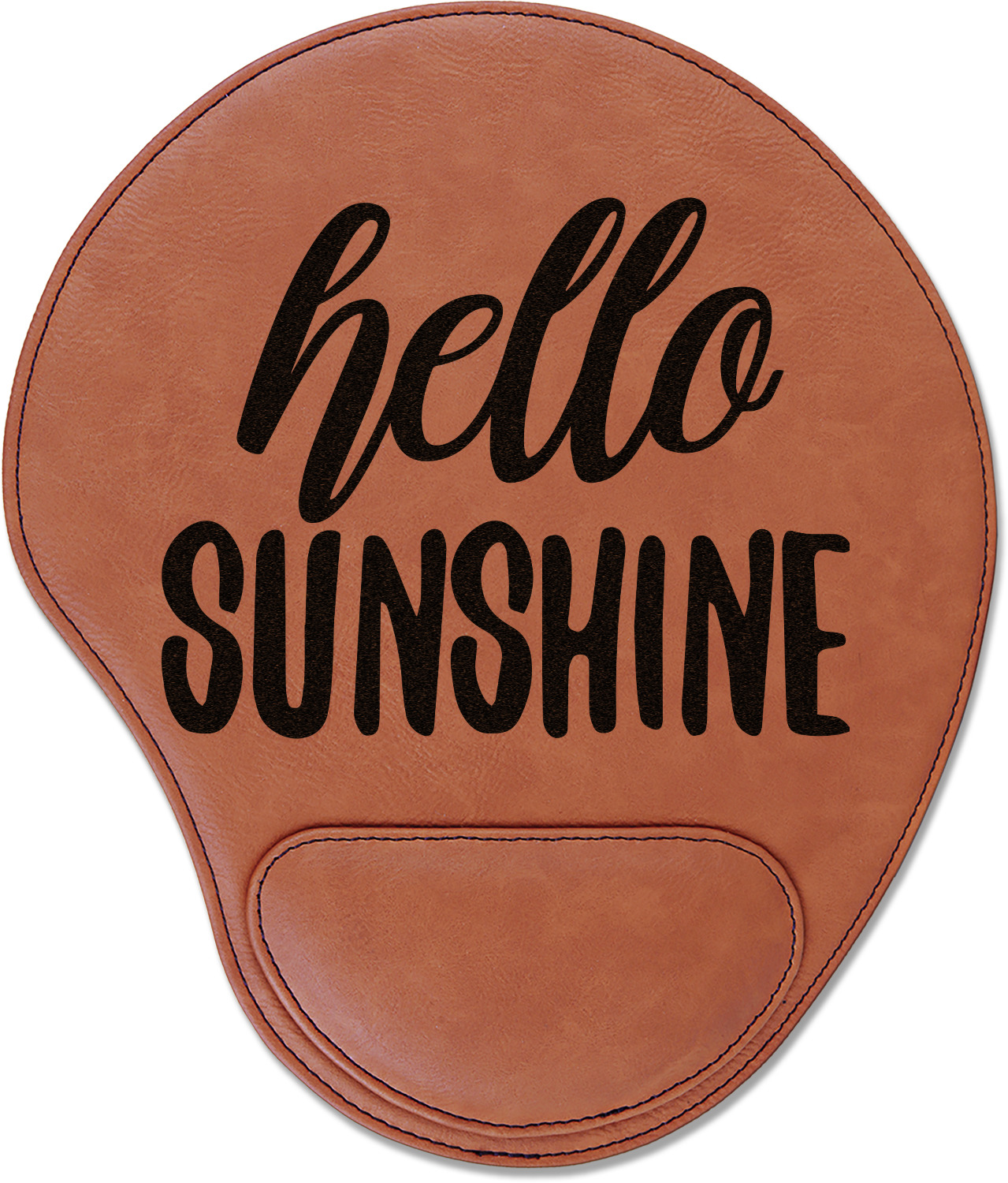 In a rounded shape, this mouse pad is made of a luxurious, cognac-colored leatherette. The nature of this material allows your mouse to glide smoothly across its surface. Strong stitching lines the edges to guarantee stability and strength. As added support for tired wrists, your personalized mouse pad features a supportive wrist rest at its bottom. This model measures at 10.25" x 9", while its wrist pad is approximately 5" x 2.75", with a thickness of 0.75". Your personalized design is laser engraved into the front face of this mouse pad.