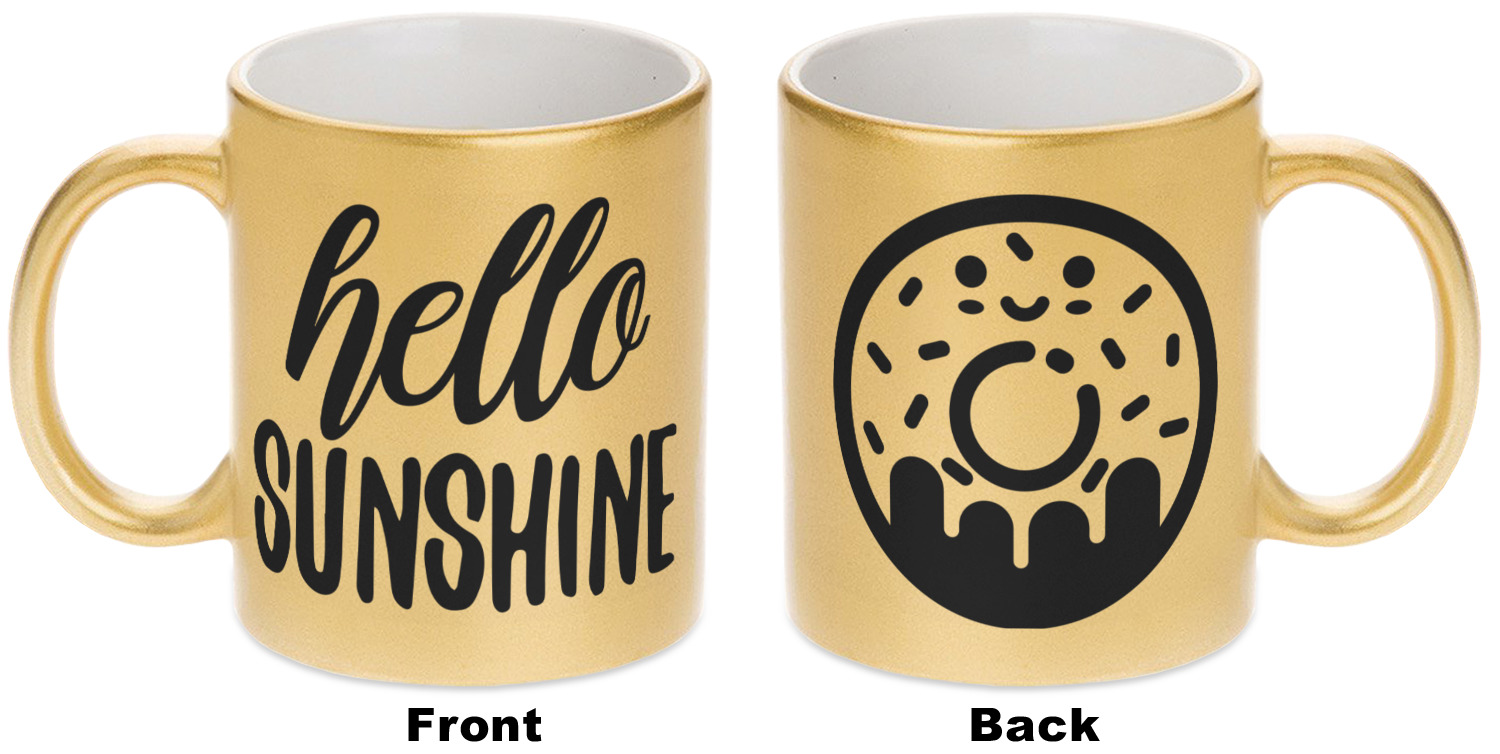 Our custom mugs are ceramic, which is great for keeping your tea or coffee warm! We offer two metallic mugs to personalize - Silver or Gold. Both styles hold around 11oz and have dimensions of approximately 3.75" x 3.5" x 4.75". Both the metallic mugs come in a matte finish and have glitter detailing to add a more pristine feel to the gold and silver base colors.