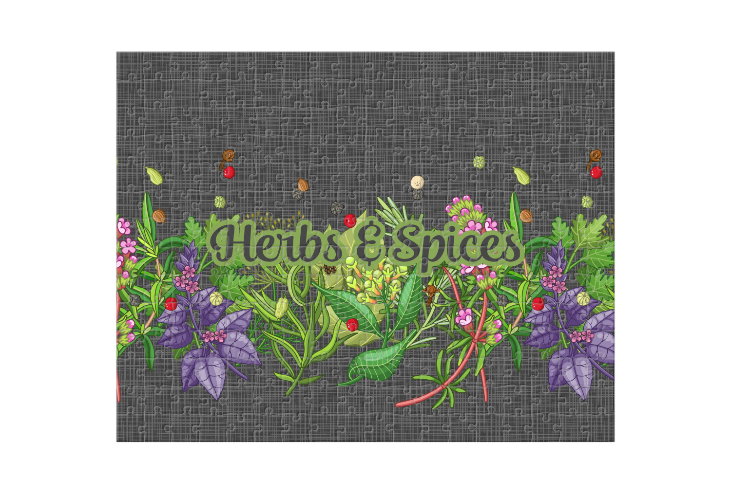 The design features an adorable frame of illustrated peppers, garlic, ginger, and other herbs. The background is a subtle texture in a charcoal color. A fun ribbon made with other spices and herbs makes the coordinating design. Both are easily personalized.