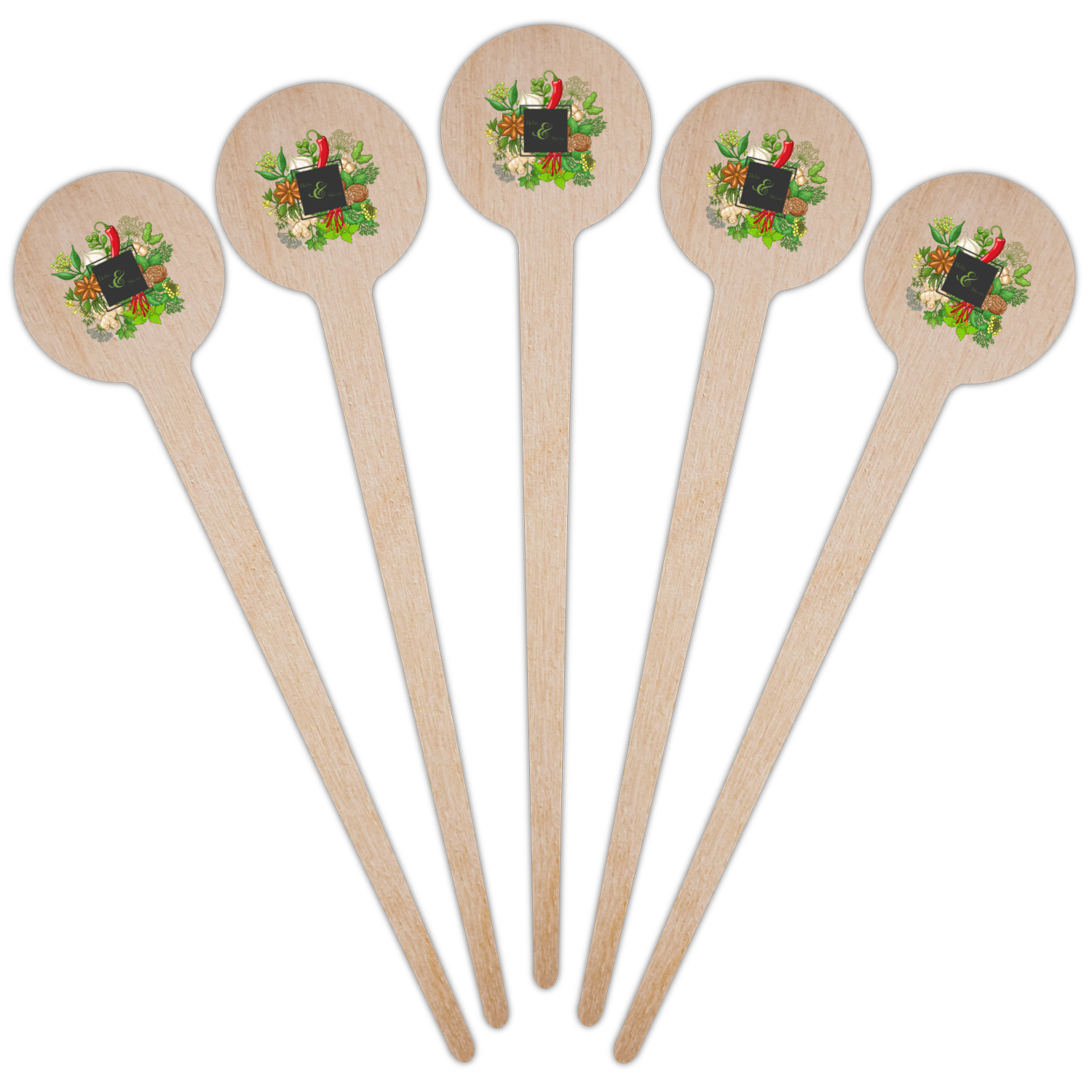 The design features an adorable frame of illustrated peppers, garlic, ginger, and other herbs. The background is a subtle texture in a charcoal color. A fun ribbon made with other spices and herbs makes the coordinating design. Both are easily personalized.