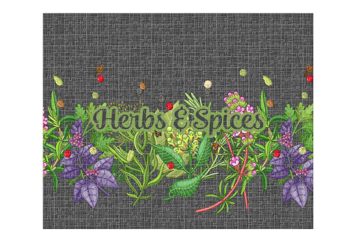The design features an adorable frame of illustrated peppers, garlic, ginger, and other herbs. The background is a subtle texture in a charcoal color. A fun ribbon made with other spices and herbs makes the coordinating design. Both are easily personalized.