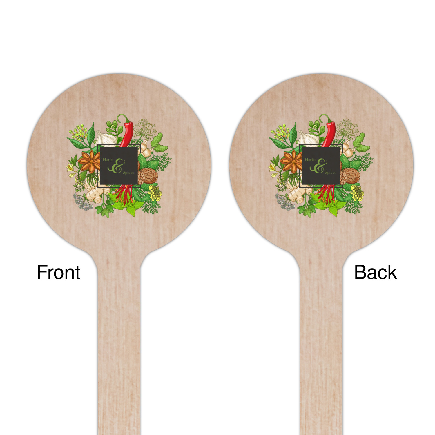 The design features an adorable frame of illustrated peppers, garlic, ginger, and other herbs. The background is a subtle texture in a charcoal color. A fun ribbon made with other spices and herbs makes the coordinating design. Both are easily personalized.