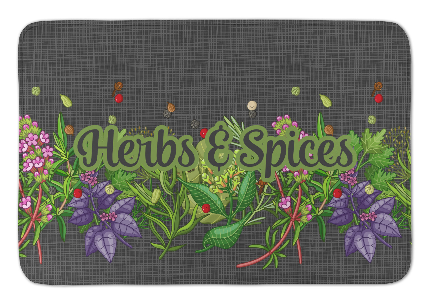 The design features an adorable frame of illustrated peppers, garlic, ginger, and other herbs. The background is a subtle texture in a charcoal color. A fun ribbon made with other spices and herbs makes the coordinating design. Both are easily personalized.