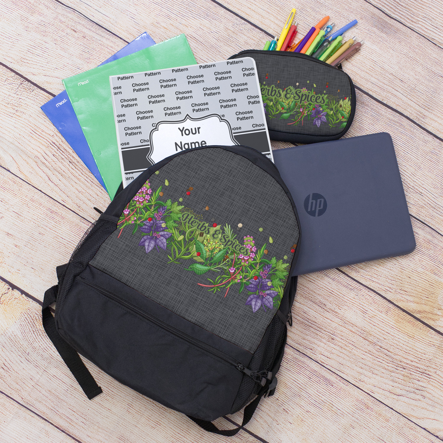 The design features an adorable frame of illustrated peppers, garlic, ginger, and other herbs. The background is a subtle texture in a charcoal color. A fun ribbon made with other spices and herbs makes the coordinating design. Both are easily personalized.